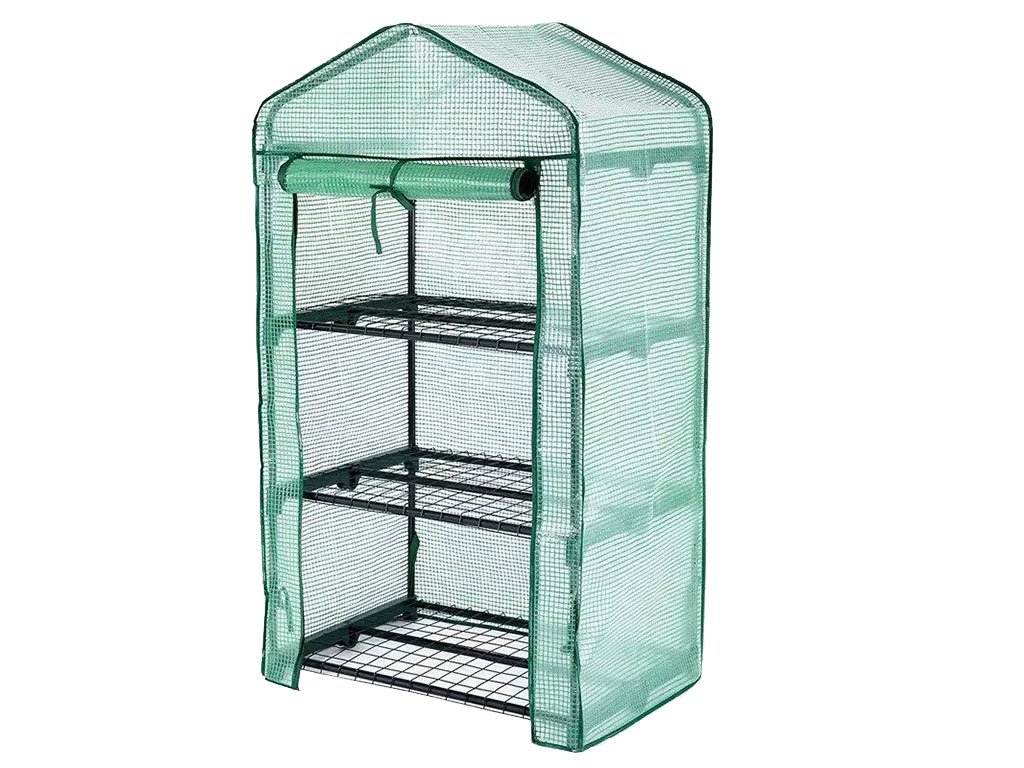 Fóliovník s 3 policemi, průhledná PVC fólie, konstrukční tyče z oceli, tyče o průměru 16mm, rolovací dveře na 2 zipy s upevňovací tkaničkou, rozměry 69x49x127 cm.