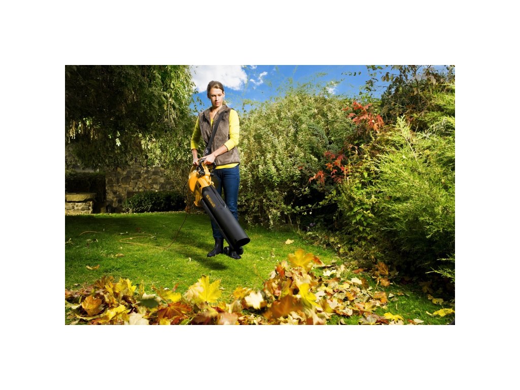 Foukač s extra silným motorem o výkonu 3000 W dosahuje rychlosti otáček 8000 - 14000 min-1 a poskytuje tak excelentní výkon. Díky elektronicky nastavitelné rychlosti proudění vzduchu 270 km/hod snadno odstraníte i vlhké a lepivé listí. Pomocí nastavitelného sacího výkonu a odolných ocelových břitů se odpad rozseká v poměru 12:1. Do 45 litrového vaku se tak vejde opravu velká hromada listí. Pro případ nasátí pevných nečistot je ventilátor vyroben z pružného nylonu, odolného proti prasknutí. Pro rychlou kontrolu nebo vyčištění ventilátoru a mulčovacích nožů je snadný přístup z boku přístroje. Jestliže máte k dispozici dostupnou přípojku, budete omezeni pouze délkou přívodního kabelu.