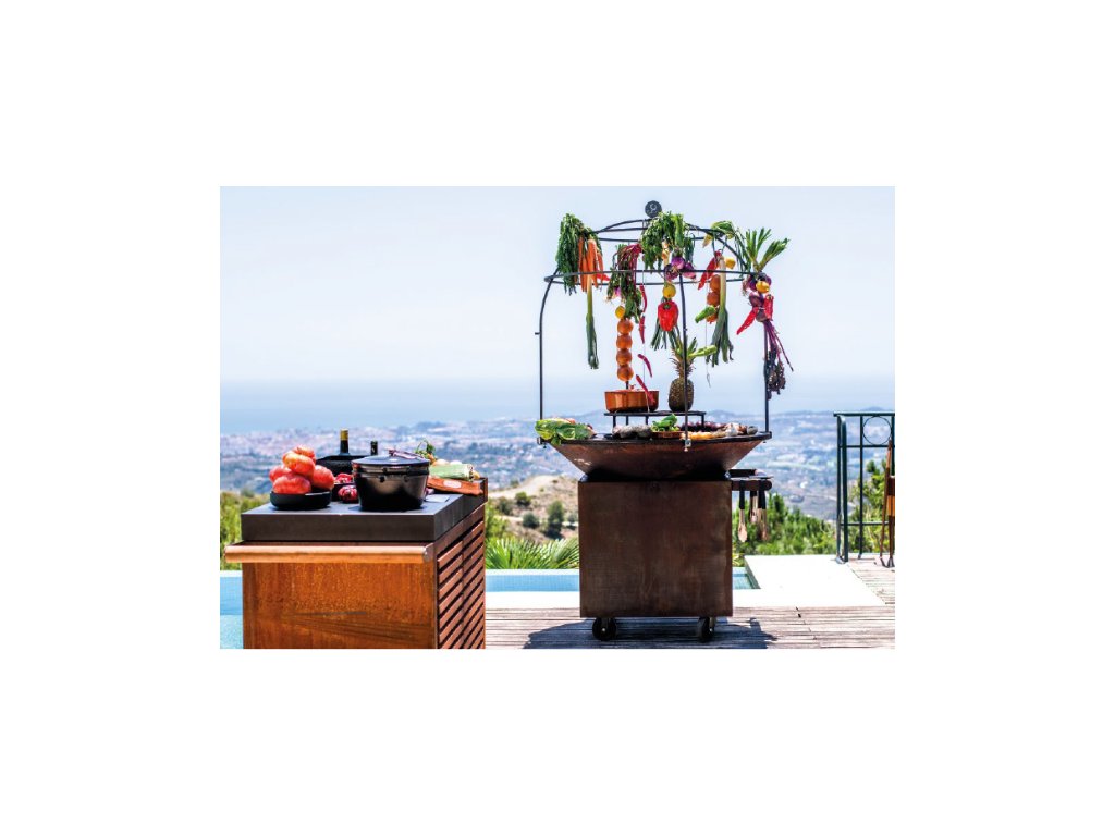 Grilovací kruhové ohniště OFYR nabízí široké možnosti grilování a vaření přímo na jeho rozpáleném povrchu. Díky kruhovému designu a ohništi ve středu můžete na něm připravit prakticky cokoli. Podobně jako u přenosných ohnišť, je OFYR mobilní a může být umístěn na podstavci nebo součástí multifunkční skříně.