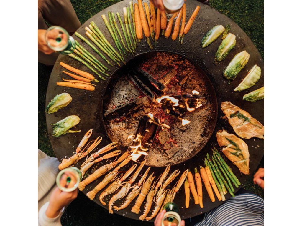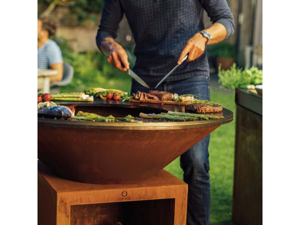 Grilovací kruhové ohniště OFYR nabízí široké možnosti grilování a vaření přímo na jeho rozpáleném povrchu. Díky kruhovému designu a ohništi ve středu můžete na něm připravit prakticky cokoli. Podobně jako u přenosných ohnišť, je OFYR mobilní a může být umístěn na podstavci nebo součástí multifunkční skříně.