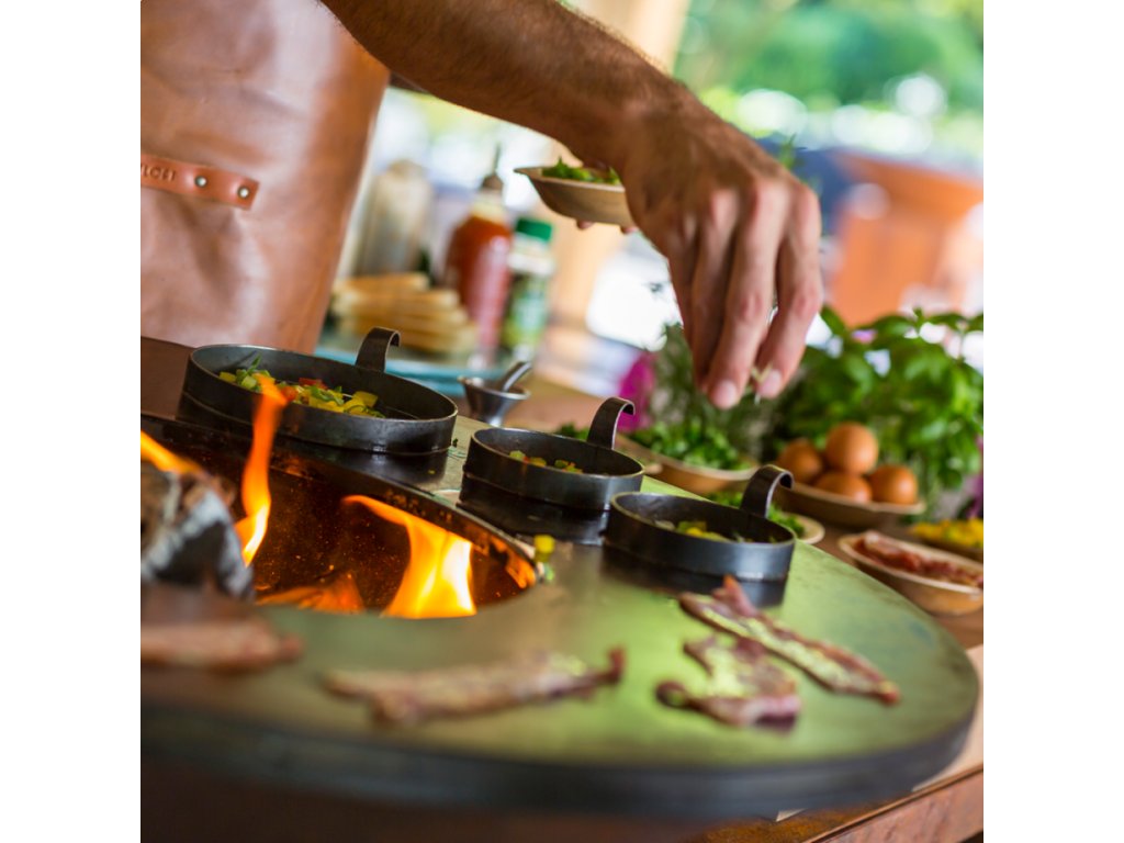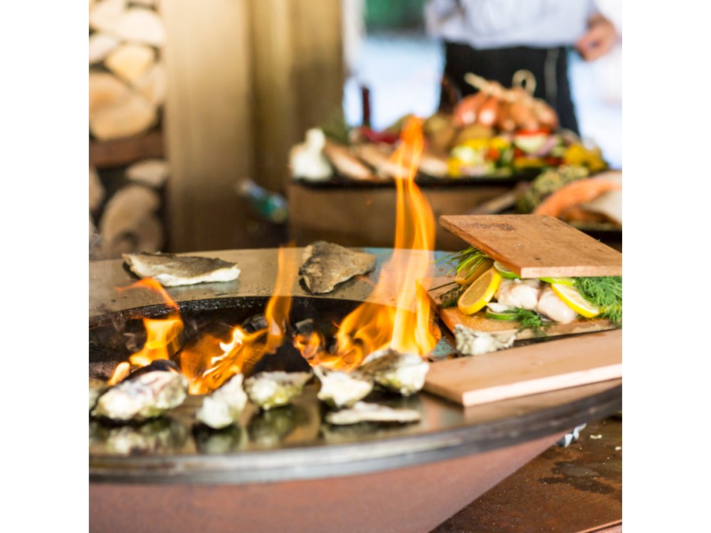 Grilovací kruhové ohniště OFYR nabízí široké možnosti grilování a vaření přímo na jeho rozpáleném povrchu. Díky kruhovému designu a ohništi ve středu můžete na něm připravit prakticky cokoli. Podobně jako u přenosných ohnišť, je OFYR mobilní a může být umístěn na podstavci nebo součástí multifunkční skříně.