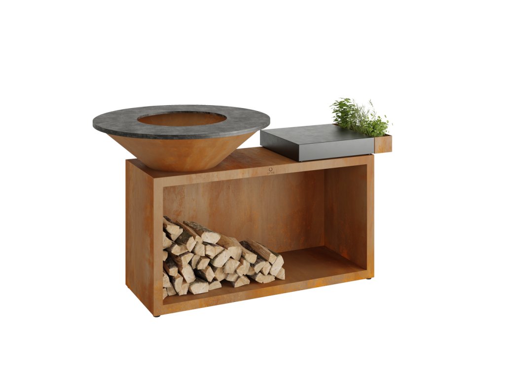 - Materiál: corten (základna a topeniště), ocel (grilovací plotna), keramika (pracovní deska)