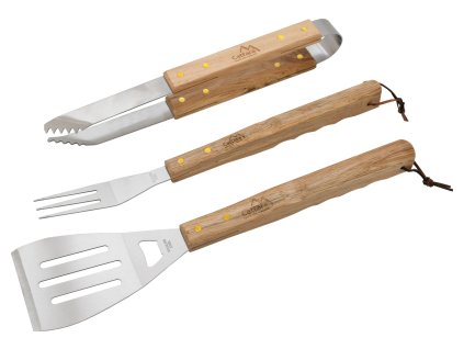 Sada tří kusů nářadí na grilování, skládající se z obracečky, vidličky a kleští.
