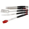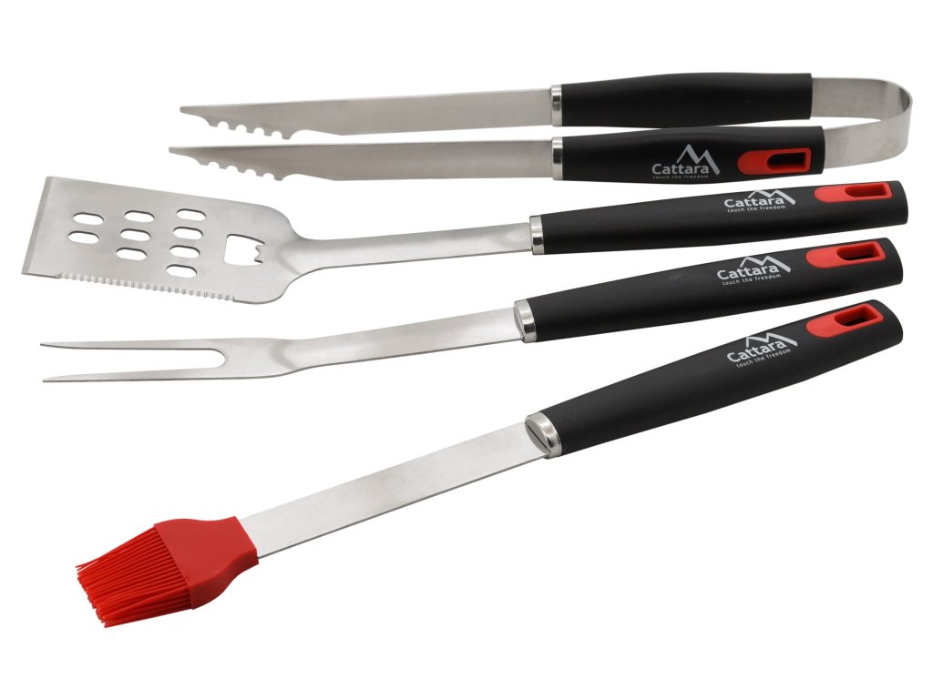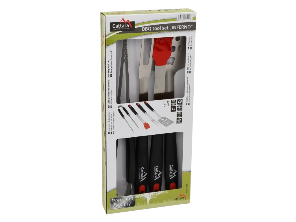 Sada čtyř kusů grilovacího nářadí skládající se z obracečky, vidličky, kleští a mašlovačky. Kleště jsou speciálně tvarovány pro jistý úchop nejrůznějších pokrmů a mají délku 39 cm. Dvouzubá vidlička s délkou 41 cm usnadní manipulaci. Obracečka délky 43 cm s precizně zabroušenou hranou, bokem uzpůsobeným k řezání a odtokovými otvory pro otáčení masitých ale i jiných pokrmů. Obracečka je navíc doplněna o otvírák lahví. Mašlovačka délky 39 cm je vhodná pro nanášení marinád a potírání pokrmů.