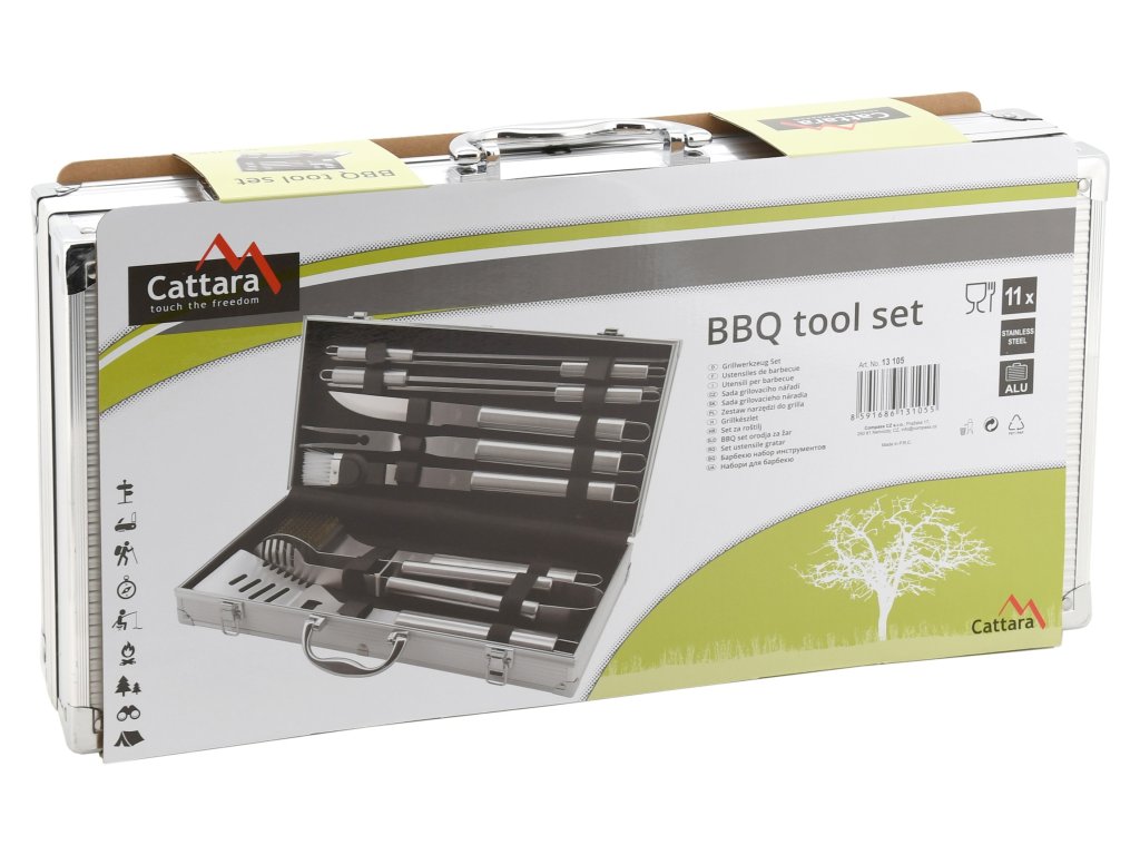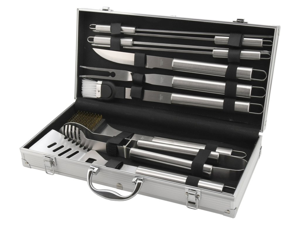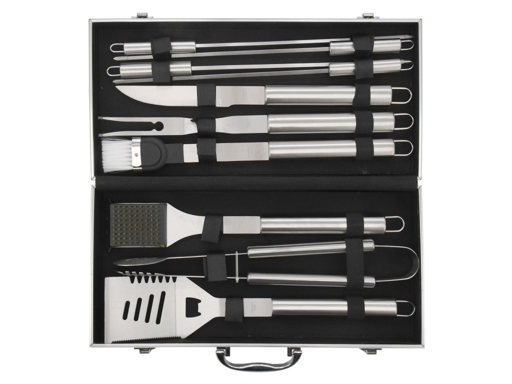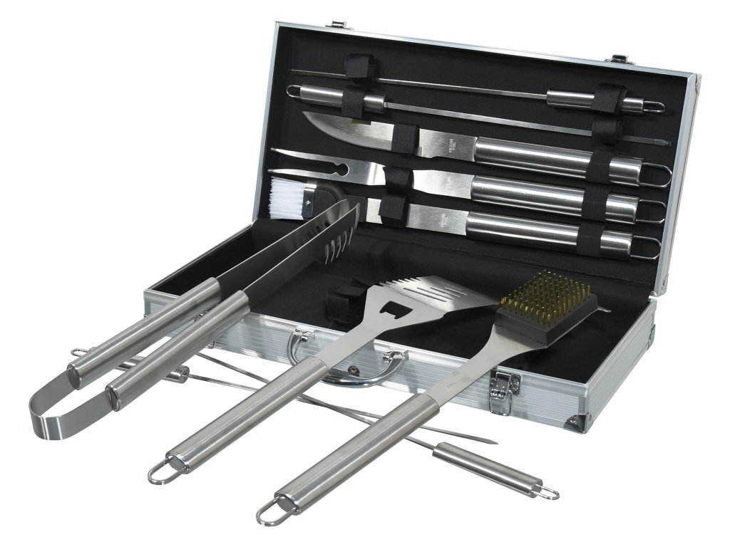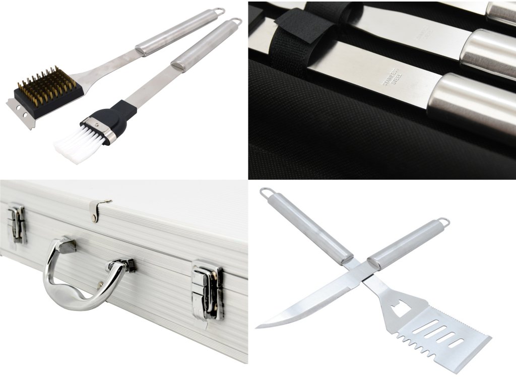 Profesionální sada 11 ks nářadí určené pro grilování a následnou údržbu grilu. Veškeré nářadí je vyrobeno z nerezové oceli, je jednoduchých tvarů, což oceníte zejména při jeho čištění. Rukojeti mají kruhový průřez a díky tomu jsou velice dobře padnoucí do ruky. Veškeré náčiní je možné pověsit na háček. Sada je úhledně umístěna v transportním kufru a hodí se i pro náročné uživatele.