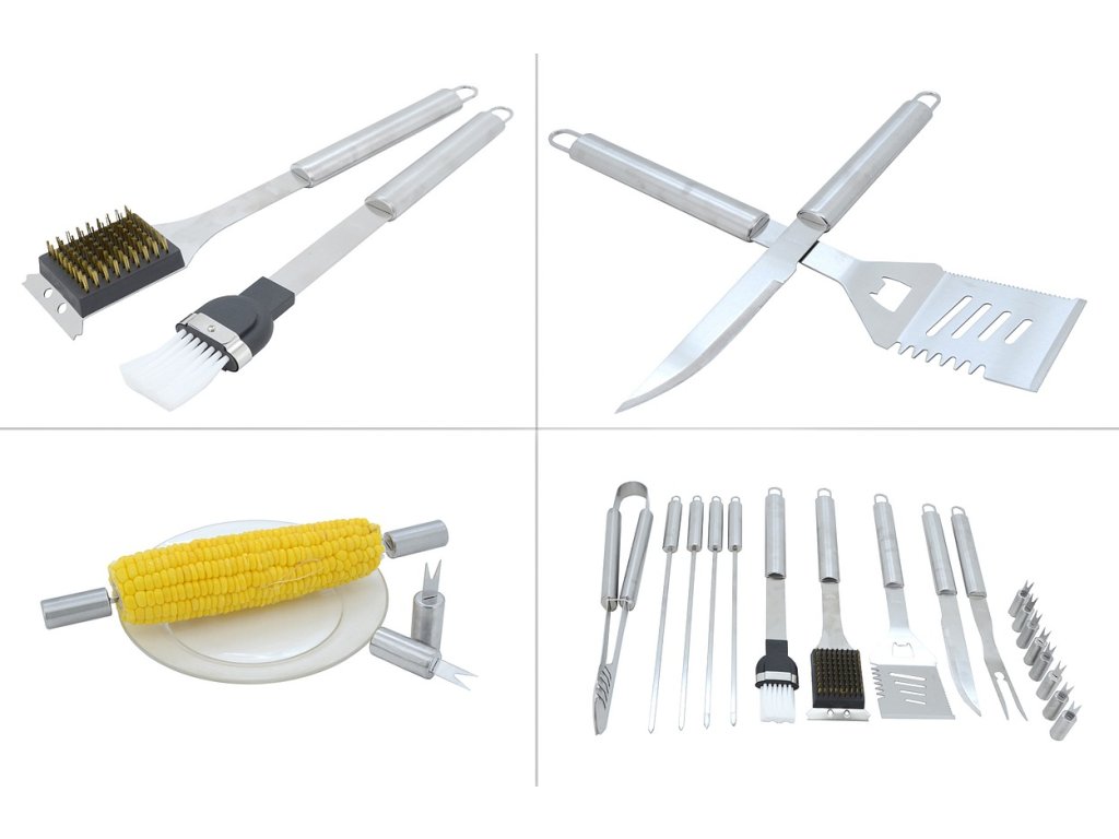 Profesionální sada 18 ks nářadí určené pro grilování a následnou údržbu grilu. Veškeré nářadí je vyrobeno z nerezové oceli. Jednoduchý tvar nástrojů zaručí nenáročné čištění a údržbu. Rukojeti mají kruhový průřez a díky tomu jsou velice dobře padnoucí do ruky. Každý kus disponuje háčkem pro zavěšení.