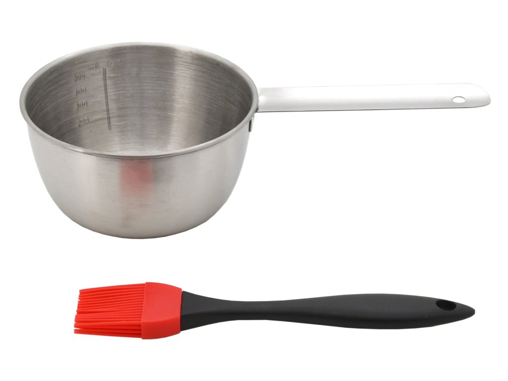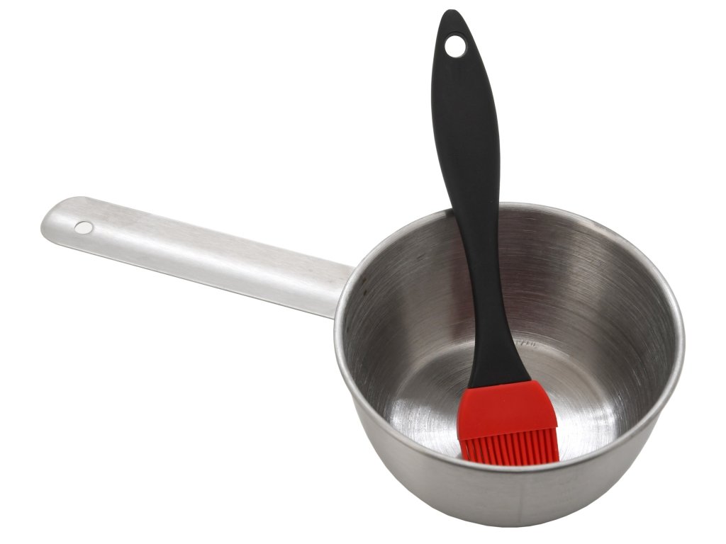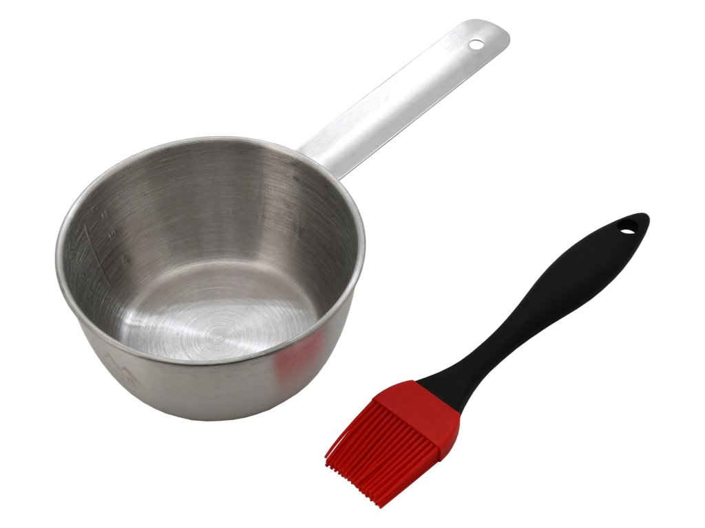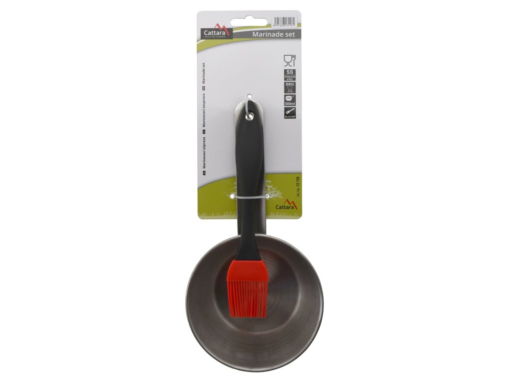 Sada je složena z nádoby z nerezové oceli, nabízející objem až pro 500 ml marinády a štětcem se silikonovými třásněmi. Oba nástroje lze pověsit na háček díky otvorům na rukojeti.