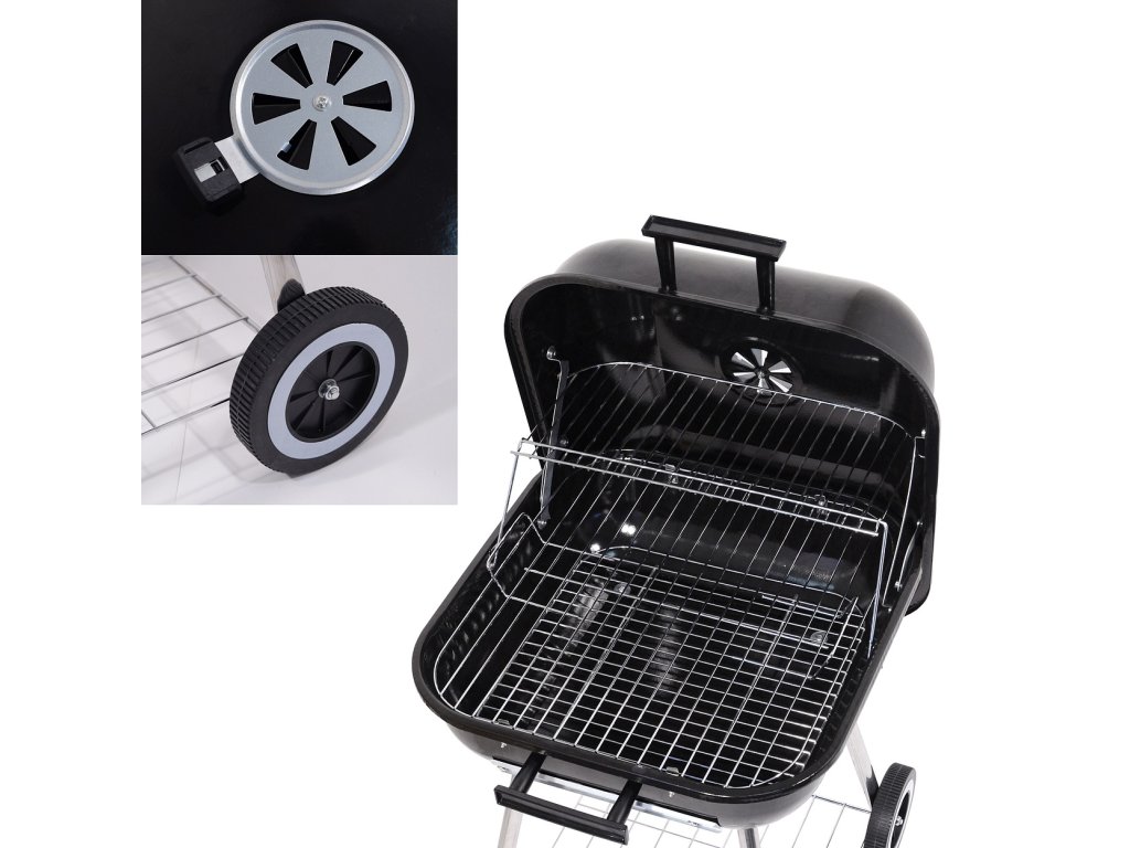 Konstrukce je vyrobena z kvalitního ocelového plechu se smaltovanou povrchovou úpravou. Madla jsou z odolného plastu a mají dostatečný prostor pro úchop. Mobilitu zajištují tři kovové nohy, doplněné o zpevňující rám ve spodní časti. Navíc je gril vybaven kolečky z plastu, která zaručují dostatečnou pohyblivost.