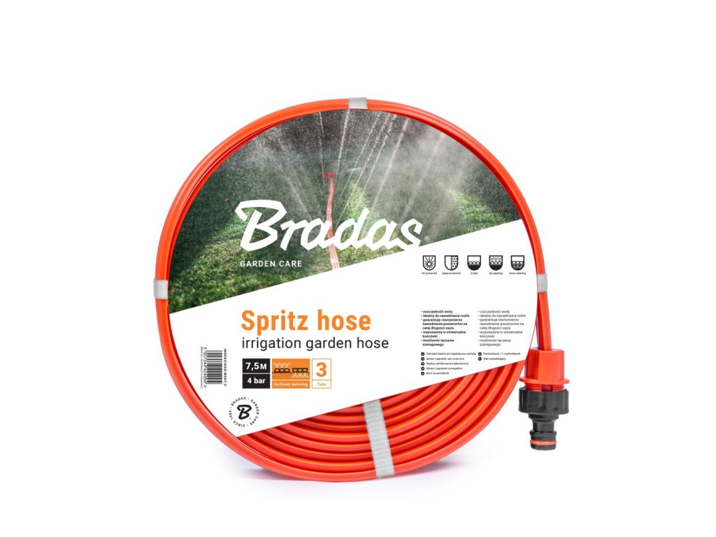 Vysoce kvalitní tříkanálová plochá hadice s mikro perforací BRADAS SPRITZ o průměru 1/2" je vyrobená z jakostního PVC materiálu. Zavlažování probíhá formou malých fontánek, nebo při obráceném použití přímo do zeminy. Šetří váš čas i spotřebu vody. Díky svému kvalitnímu zpracování je vhodná zejména pro zavlažování zahrad, trávníků nebo květinových záhonů atd. Je vhodná pro použití v zemědělství.