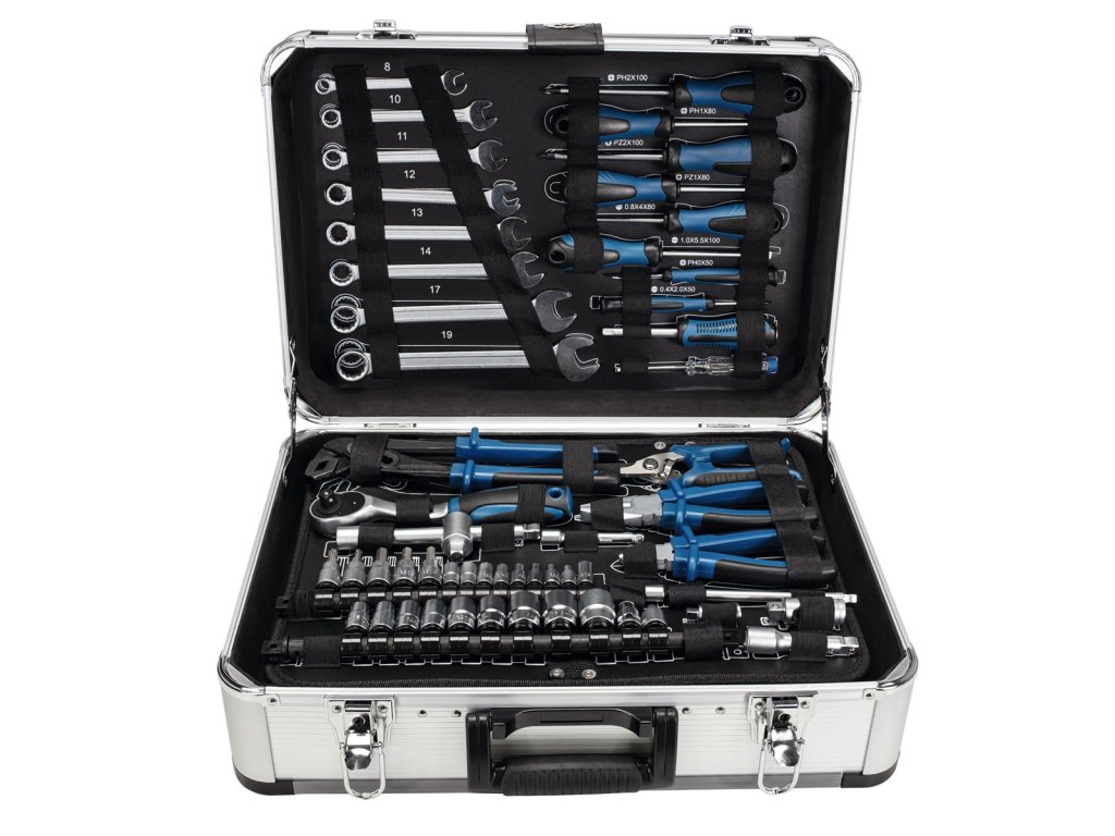 TB 150 - hliníkový kufr s nářadím, 101 dílů Scheppach TB 150 je velmi praktická sada nejpotřebnějšího nářadí (101 ks) ukrytá v robustním celokovovém kufru. Každý kus nářadí má přesně stanovené místo a bude tak vždy a rychle po ruce. I díky svým rozměrům kufr nezabere moc místa, dá se pomocí přezek pevně uzavřít a zamknout a můžete ho snadno přenést na místo, kde budete nářadí potřebovat. Nářadí bylo vyvinuto tak, aby kvalitativně překračovalo běžné standardy v tomto cenovém segmentu. Kvalitní slitina Cr-V, jakostní plast na rukojetích i pogumované protiskluzové zóny všude tam, kde je to potřeba zaručí, že Vám bude nářadí sloužit po mnoho let. Obsahuje: Horní patro: 8 stranových klíčů, 6 šroubováků (ploché i křížové), 2 přesné hodinářské šroubováky, zkoušečka napětí, přepínací ráčna 72 zubů, 2 bitové adaptéry, adaptér na nástrčný ořech, 9 nástrčných ořechů 10 mm (3/8"), 8 nástrčných ořechů 6,3 mm (1/4"), 2 kardanové klouby, 3 prodloužení, prodloužení s posuvnou redukcí, 5 bitových nástavců, nástrčný šroubovák na bity, instalatérské kleště, štípací kleště, kombinované kleště Spodní patro: univerzální nůžky, ruční pilka s pilovým listem na kov, 3 náhradní pilové listy (1 x kov, 2 x dřevo), zalamovací nůž, 5 x čepel pro zalamovací nůž, 7 imbusových klíčů, kladivo, 5 m svinovací metr, držák bitů a 27 bitů v praktickém plastovém pouzdřeDoplňkové parametry