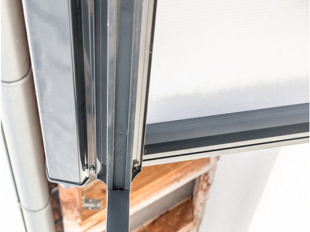 Zastřešení je řešeno průsvitným komůrkovým polykarbonátem Guttagliss DUAL BOX 10 mm, který je opatřen speciální strukturou pro rozptyl světla. Důležité je také uzavření komůrek ventilační páskou, které zamezuje vzniku kondenzátu a dalšímu nechtěnému znečištění. Polykarbonát je opatřen jednostrannou UV ochranou. To vše zaručuje vysokou odolnost proti nepříznivému počasí. Komůrkový polykarbonát splňuje veškeré podmínky pro udělení atestace zdravotní nezávadnosti toxikologickým centrem, vydaným státním zdravotním ústavem.