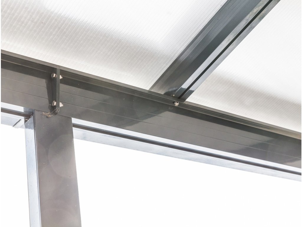 Zastřešení je řešeno průsvitným komůrkovým polykarbonátem Guttagliss DUAL BOX 10 mm, který je opatřen speciální strukturou pro rozptyl světla. Důležité je také uzavření komůrek ventilační páskou, které zamezuje vzniku kondenzátu a dalšímu nechtěnému znečištění. Polykarbonát je opatřen jednostrannou UV ochranou. To vše zaručuje vysokou odolnost proti nepříznivému počasí. Komůrkový polykarbonát splňuje veškeré podmínky pro udělení atestace zdravotní nezávadnosti toxikologickým centrem, vydaným státním zdravotním ústavem.
