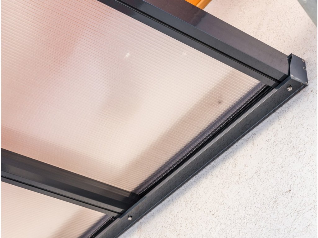 Zastřešení je řešeno průsvitným komůrkovým polykarbonátem Guttagliss DUAL BOX 10 mm, který je opatřen speciální strukturou pro rozptyl světla. Důležité je také uzavření komůrek ventilační páskou, které zamezuje vzniku kondenzátu a dalšímu nechtěnému znečištění. Polykarbonát je opatřen jednostrannou UV ochranou. To vše zaručuje vysokou odolnost proti nepříznivému počasí. Komůrkový polykarbonát splňuje veškeré podmínky pro udělení atestace zdravotní nezávadnosti toxikologickým centrem, vydaným státním zdravotním ústavem.