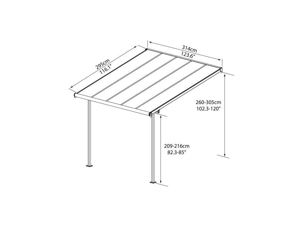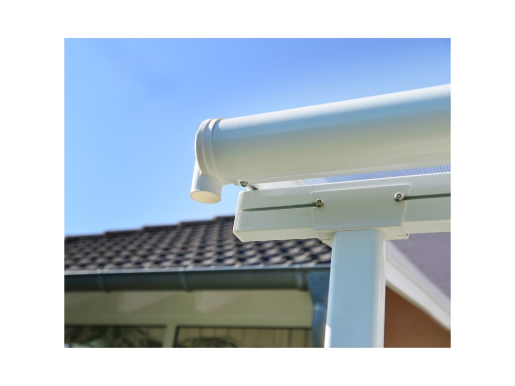 Bezúdržbový hliníkový rám s galvanicky ošetřenými kovovými prvky je ošetřen práškovou barvou a je vysoce odolný vůči rezavění, plísním či mechům. Díky nastavitelné výšce ukotvení a posuvným opěrným nohám vyhoví většině běžných verand. Možno využít z boku domu jako přístřešek pro auto a vybavit LED osvětlením, krycí zástěnou nebo boční stěnou.