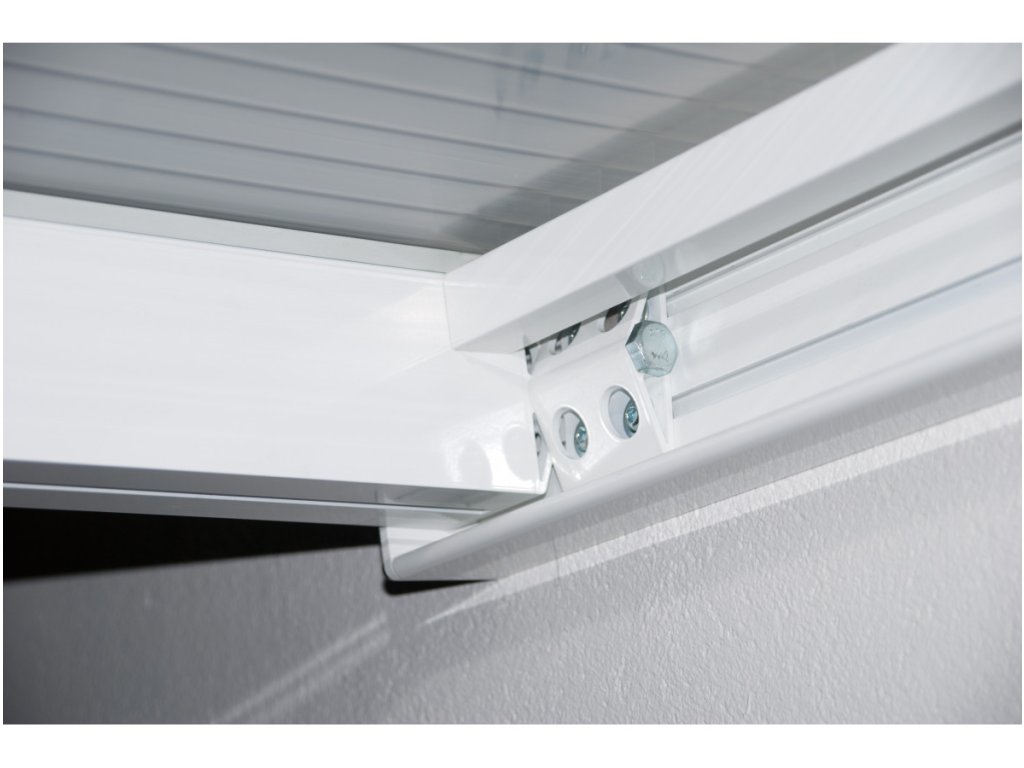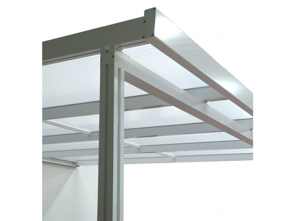 Robustní konstrukce pergoly je vyrobena z vysoce odolných, eloxovaných, hliníkových dutých profilů 8 x 8 cm, opatřených antikorozním nástřikem práškovým lakováním v bílé barvě. Díky tomu je pergola vysoce odolná vůči rezavění, plísním a mechům a je v podstatě bezúdržbová. Sloupky jsou opatřeny výškově stavitelným systémem pro snadné vyrovnání výškových nerovností. Pergola je vybavena integrovaným okapem s výstupem vody na obou stranách.