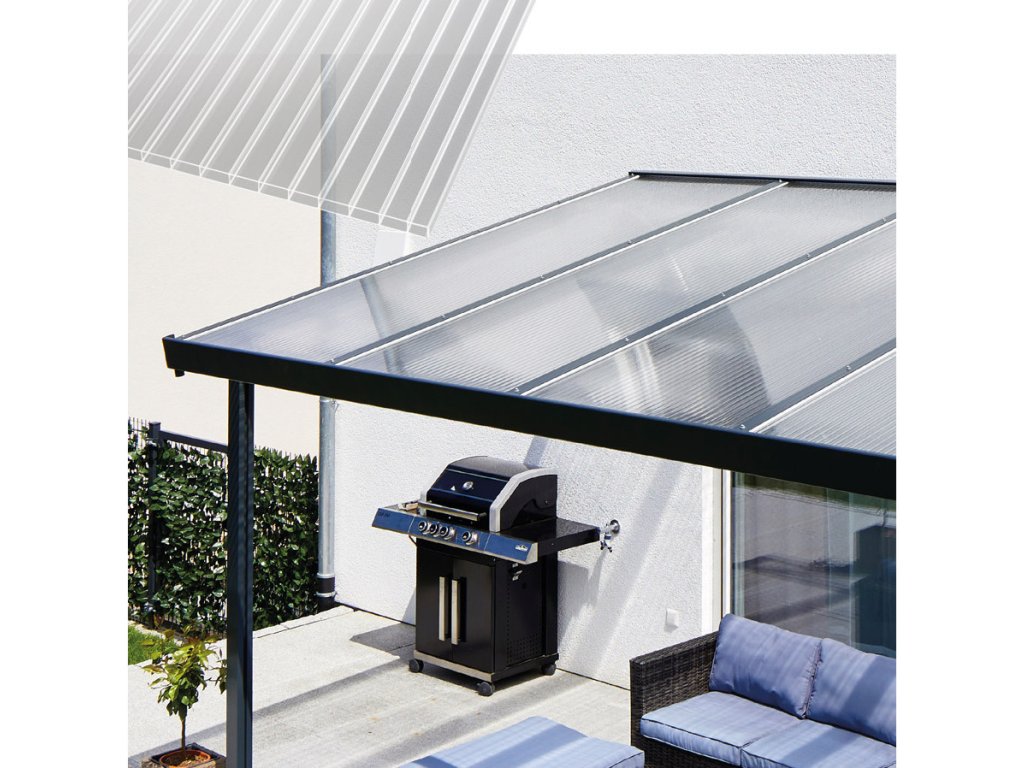 Pergola Terrassendach Premium o rozměrech délka 3,09 x šířka 3,06 m je tvořena 2 podpěrnými sloupy a 3 střešními panely. Zabírá plochu 9,47 m2 a její odolnost na zatížení sněhem je 200 kg/m2.