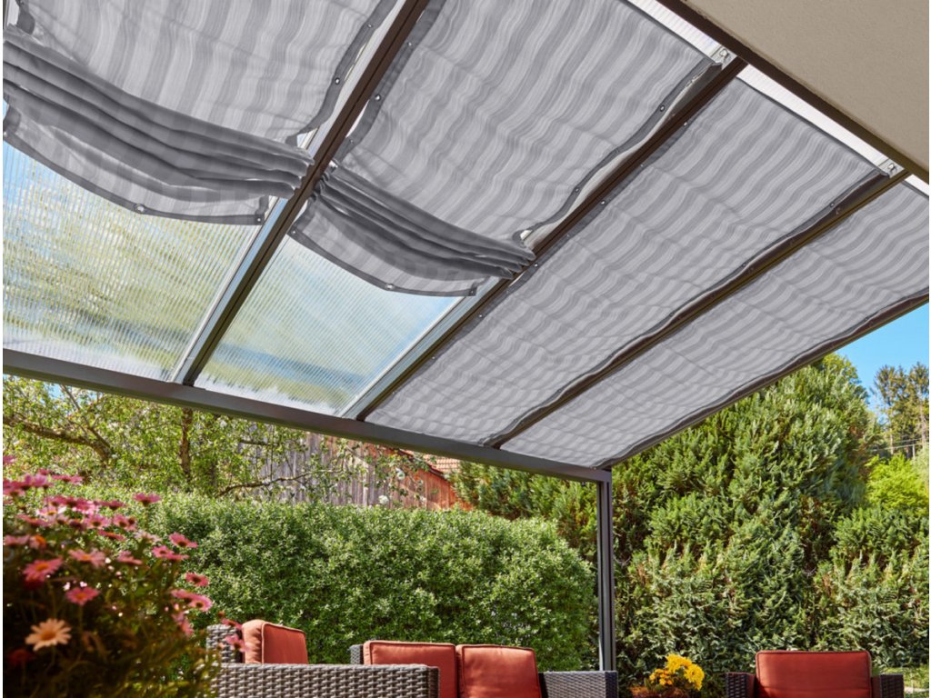 Zastřešení je řešeno čirým akrylovým sklem 16 mm. Akryl je opatřen jednostrannou UV ochranou. To vše zaručuje vysokou odolnost proti nepříznivému počasí. Akrylové sklo splňuje veškeré podmínky pro udělení atestace zdravotní nezávadnosti toxikologickým centrem, vydaným státním zdravotním ústavem. Pergola dále nabízí možnost variabilního nastavení sklonu střechy od 5° do 20°. Pro zvýšení komfortu při pobytu pod pergolou lze dokoupit efektivní zastínění ve čtyřech barevných variantách a třech hloubkách.