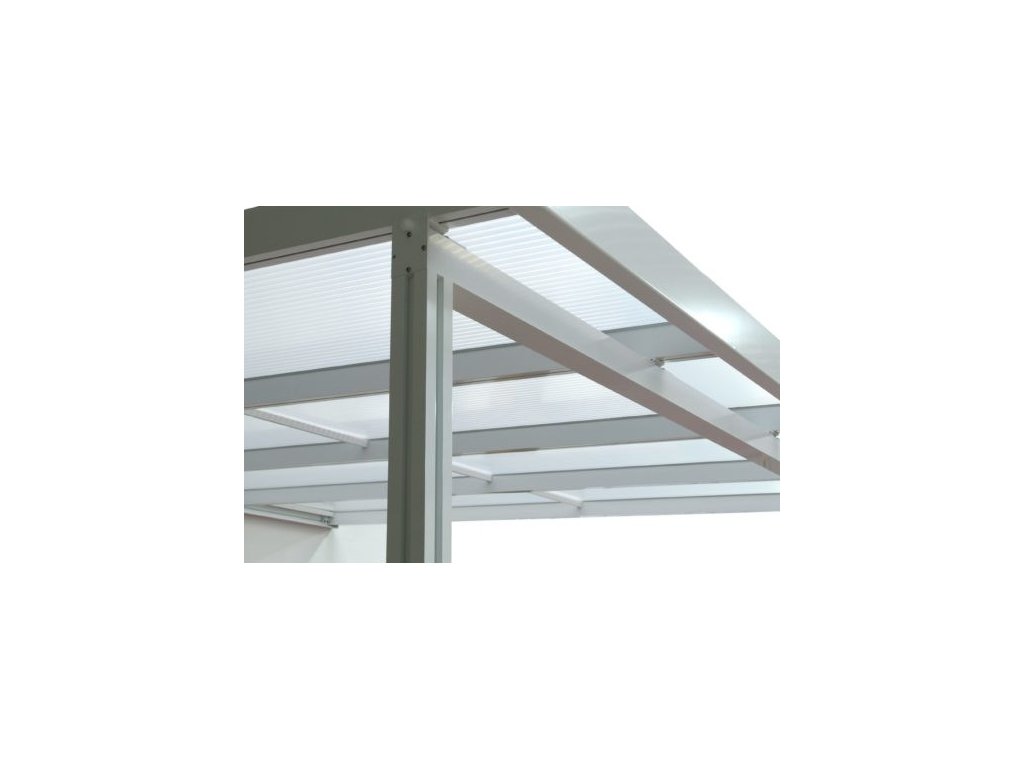 Zastřešení je řešeno průsvitným komůrkovým polykarbonátem s bílými pruhy Guttagliss DUAL 16 mm. Polykarbonát je opatřen jednostrannou UV ochranou. To vše zaručuje vysokou odolnost proti nepříznivému počasí. Komůrkový polykarbonát splňuje veškeré podmínky pro udělení atestace zdravotní nezávadnosti toxikologickým centrem, vydaným státním zdravotním ústavem. Pergola dále nabízí možnost variabilního nastavení sklonu střechy od 5° do 20°. Pro zvýšení komfortu při pobytu pod pergolou lze dokoupit efektivní zastínění ve čtyřech barevných variantách a třech hloubkách.