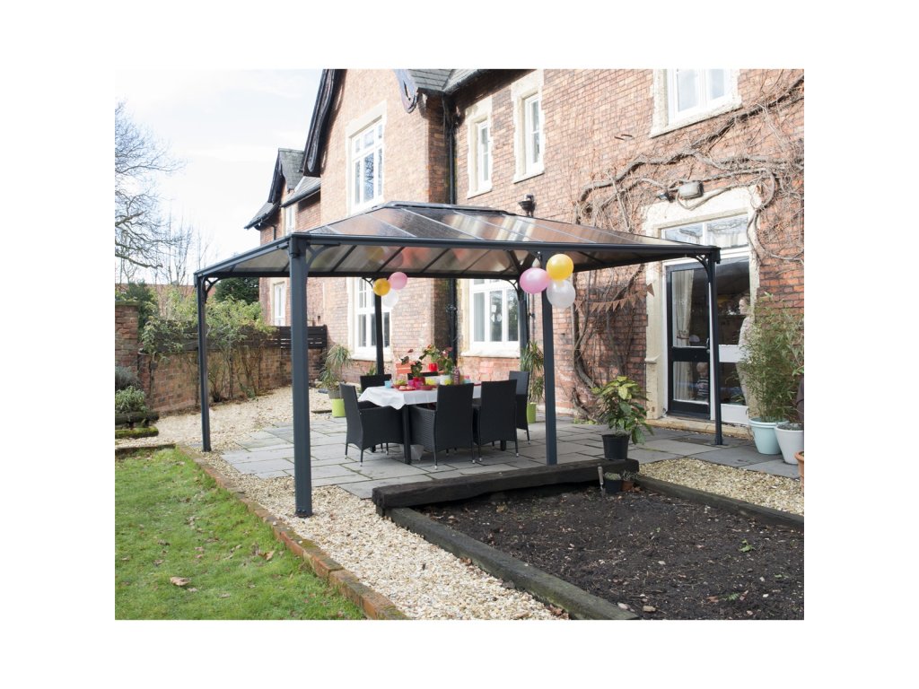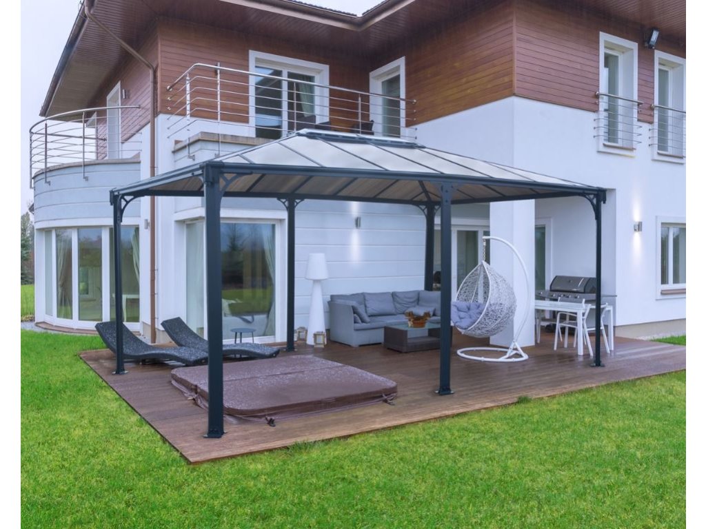 Martinique 5000 hliníkový altán od značky PALRAM Martinique je vhodné pro krytí venkovního posezení, grilu nebo venkovní vířivky. Tyto altány mají robustní konstrukci a střechu sestávající z 6 mm silných dvoukomůrkových polykarbonátových panelů, které dokonale ochrání před nepříznivým počasím, včetně deště, kroup, sněhu a škodlivého UV záření. Hliníková konstrukce je v barvě antracitu.