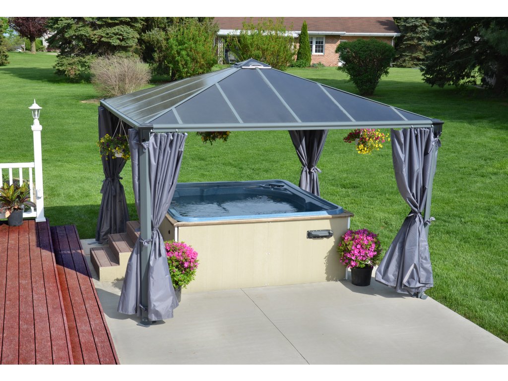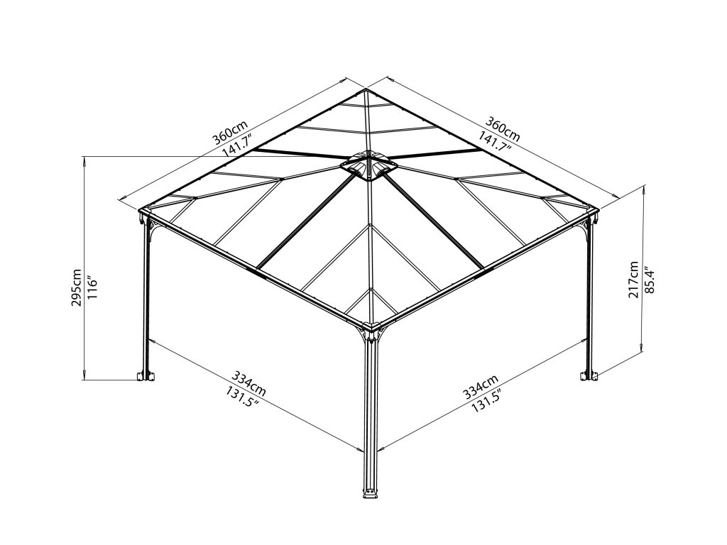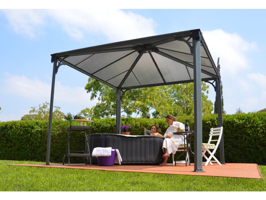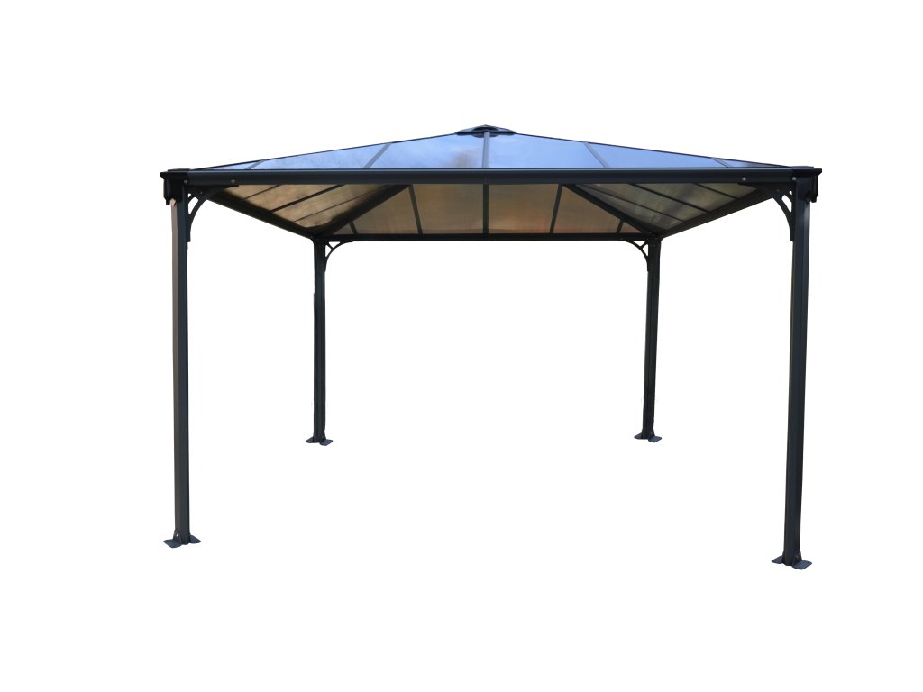 Palermo 3600 hliníkový altán od značky PALRAM Palermo je vhodné pro krytí venkovního posezení, grilu nebo venkovní vířivky. Tyto altány mají robustní konstrukci a střechu sestávající z 6 mm silných dvoukomůrkových polykarbonátových panelů, které dokonale ochrání před nepříznivým počasím, včetně deště, kroup, sněhu a škodlivého UV záření. Hliníková konstrukce je v barvě antracitu.