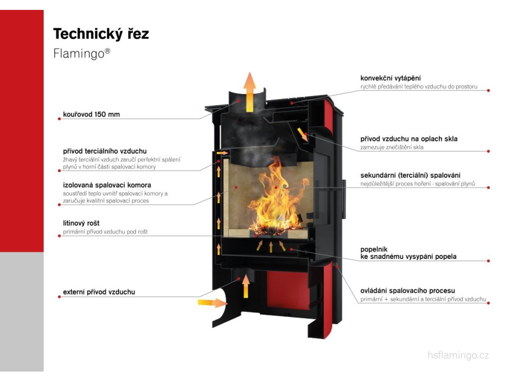 Hlavní předností je sekundární spalování, které pomocí terciárního přívodu vzduchu zajišťuje vysokou účinnost spalování, kdy dochází k procesu zužitkování zbytkových hořlavých plynů, které by běžně odcházely se zplodinami komínem. Celý spalovací proces je ovládán dvěma táhly, kdy první slouží k regulaci primárního vzduchu, který je zapotřebí k zatopení a rozhoření dřeva. Druhé táhlo slouží k podpoře sekundárního spalování. Jeho otevřením dochází k přísunu předehřátého vzduchu do horní části spalovací komory. Tento vzduch se používá k úspornému a co nejefektivnějšímu průběhu hoření dřeva. Tímto je zajištěna vysoká účinnost a krásné hoření včetně čistého skla.