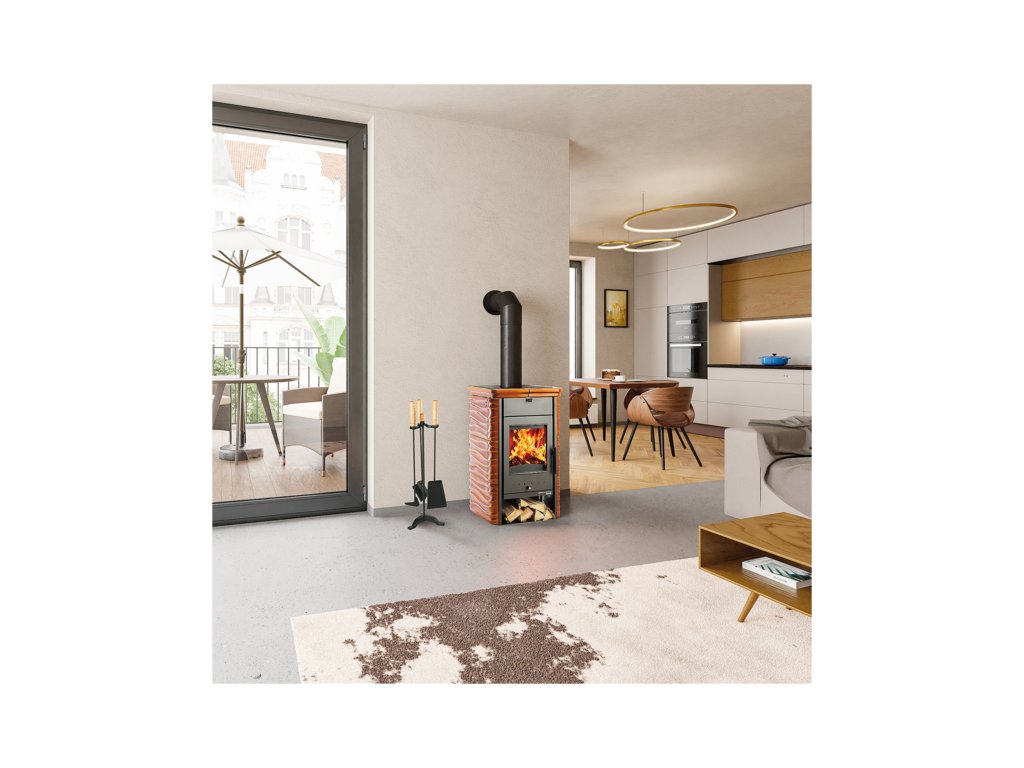 Pohled na plápolající oheň doplňuje elegantní prosklení dvířek, které vytváří kouzelnou atmosféru a zároveň umožňuje dokonalý přehled o plameni. Výrobce doporučuje jako palivo kvalitní suché dřevo nebo dřevěné brikety, čímž se dosahuje efektivní spalování i dlouhodobý tepelný výkon.