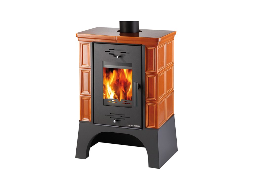Kamna Haas+Sohn EBOLI s výkonem 8 kW s kachlovým obkladem bez dekoru v barvě karamel. Užijte si teplo a pohodlí s kamny EBOLI, kde tradice potkává modernost.