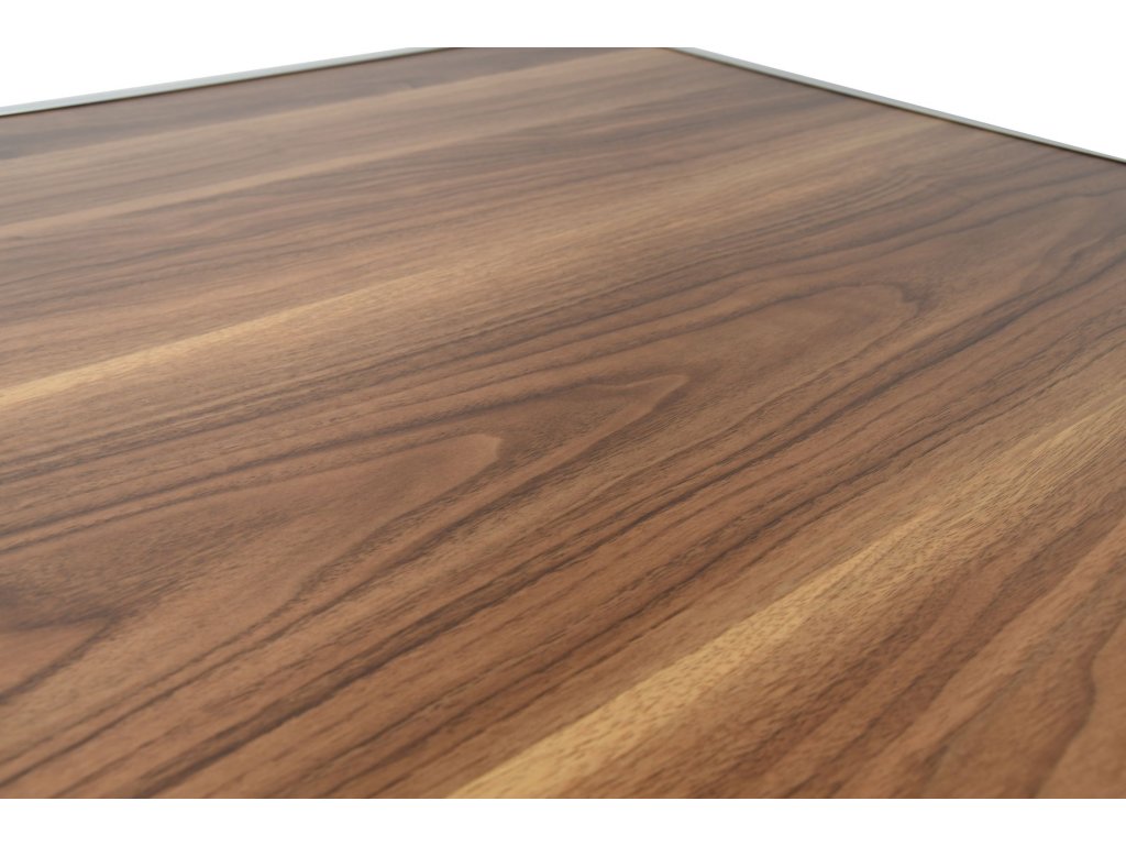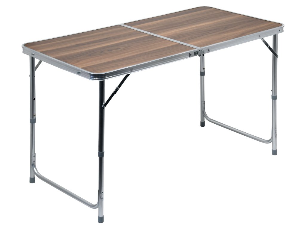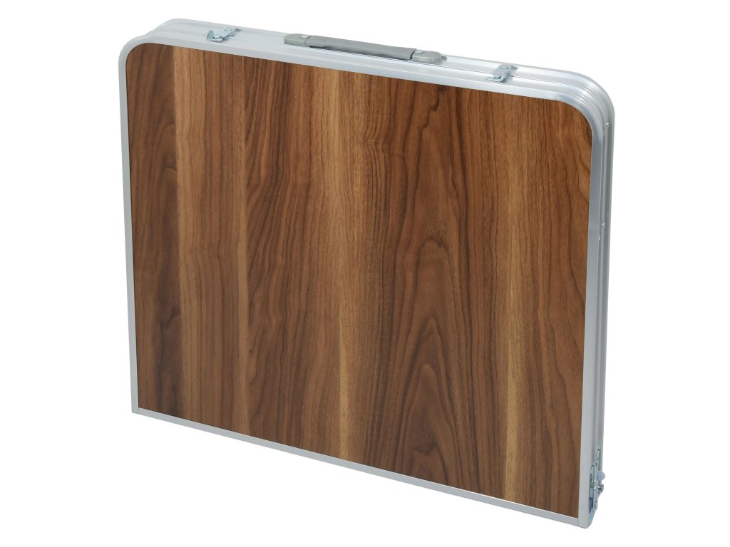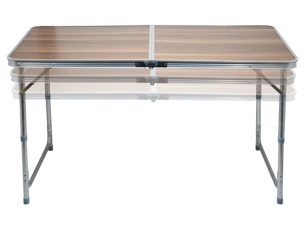 Stůl Double je skládací, teleskopický stůl zhliníkové konstrukce, s rovnou plochou a vzorem kvalitně imitujícím dřevo.