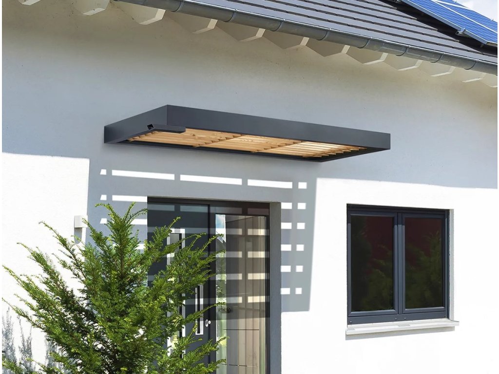 Rovná stříška nad vchodové dveře německé výroby Guttavordach BS Timber-Line s rozměry 200 × 90 cm představuje ideální a velmi elegantní spojení tří různých materiálů - hliníku, dřeva a skla. Zkrášlí prostor vstupu do vašeho domu a současně je dokonalou ochranou vašich dveří před deštěm, sněhem a větrem. Je vhodná pro zastřešení vchodů, balkonů, výloh obchodů, nebo například pro zastřešení nad bankomaty.