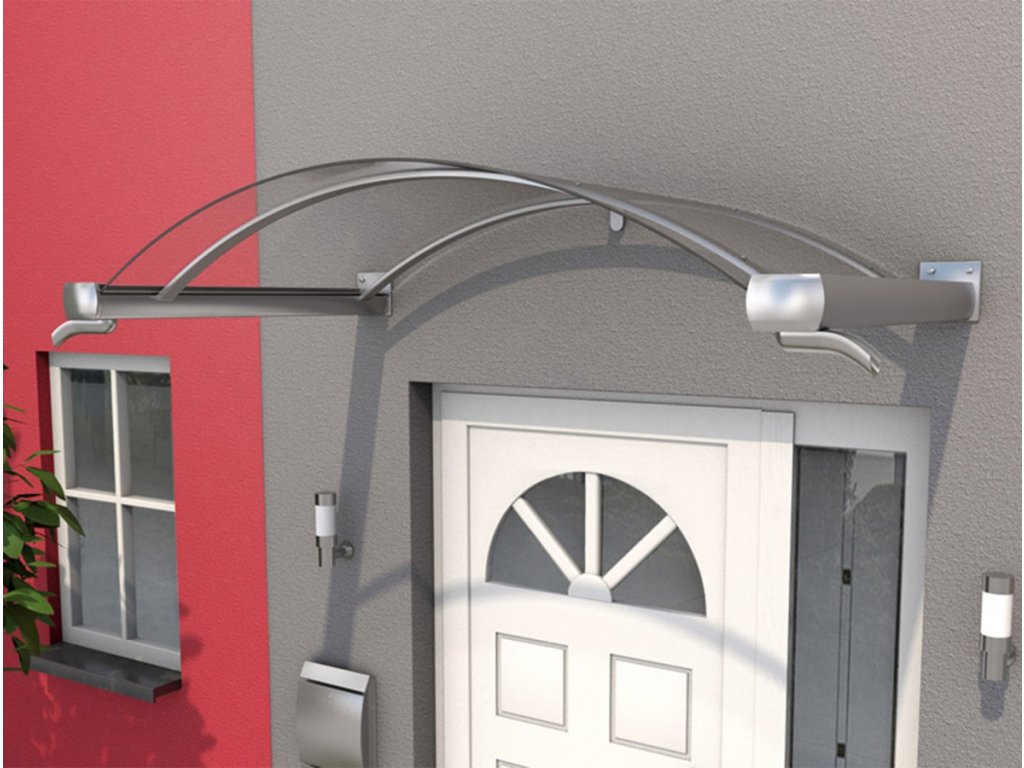 Moderní oblouková stříška nad vchodové dveře Guttavordach BV/B 200 × 90 cm zkrášlí prostor vstupu do vašeho domu a současně je dokonalou ochranou vašich dveří před deštěm, sněhem a větrem. Zvýšený komfort vám zajistí integrovaný okapový žlab s chrličem vody po obou stranách. Je vhodná pro zastřešení vchodů, balkonů, výloh obchodů, nebo například pro zastřešení nad bankomaty.