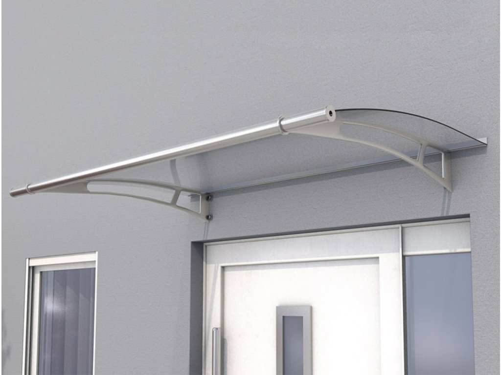 Stříšku nabízíme v rozměrech - šířka 270 cm × hloubka 95 cm × výška oblouku 17 cm a barevné kombinaci - stříbrné profily + zasklení čirým plným polykarbonátem 4 mm.