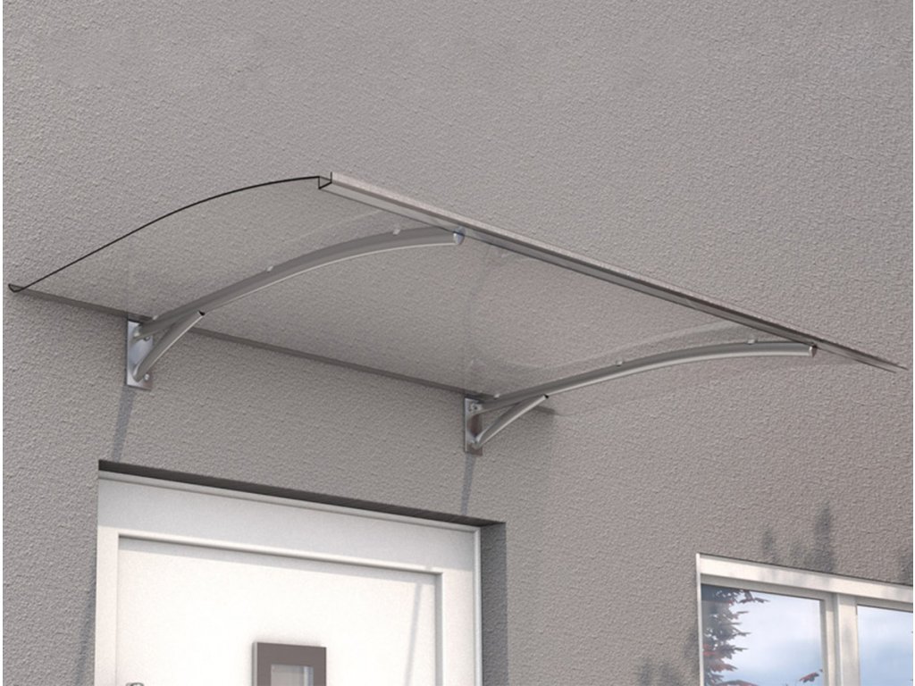 Stříšku nabízíme v rozměrech - šířka 200 cm × hloubka 90 cm a barevné kombinaci - stříbrné profily + zasklení čirým plným polykarbonátem 3 mm.