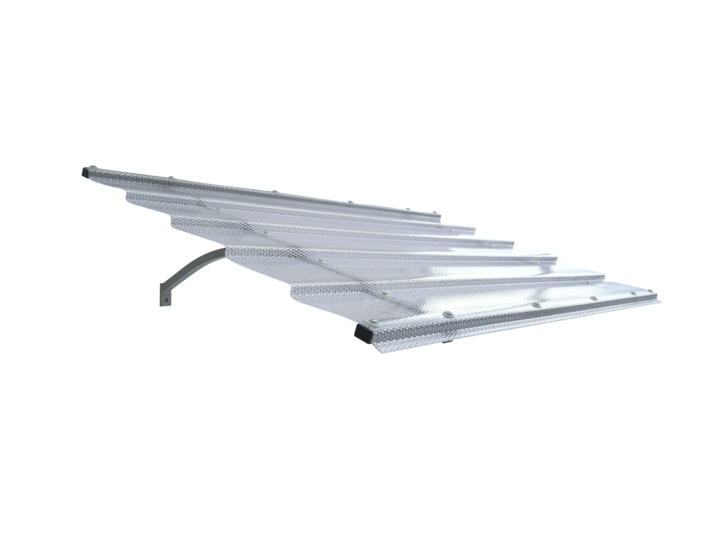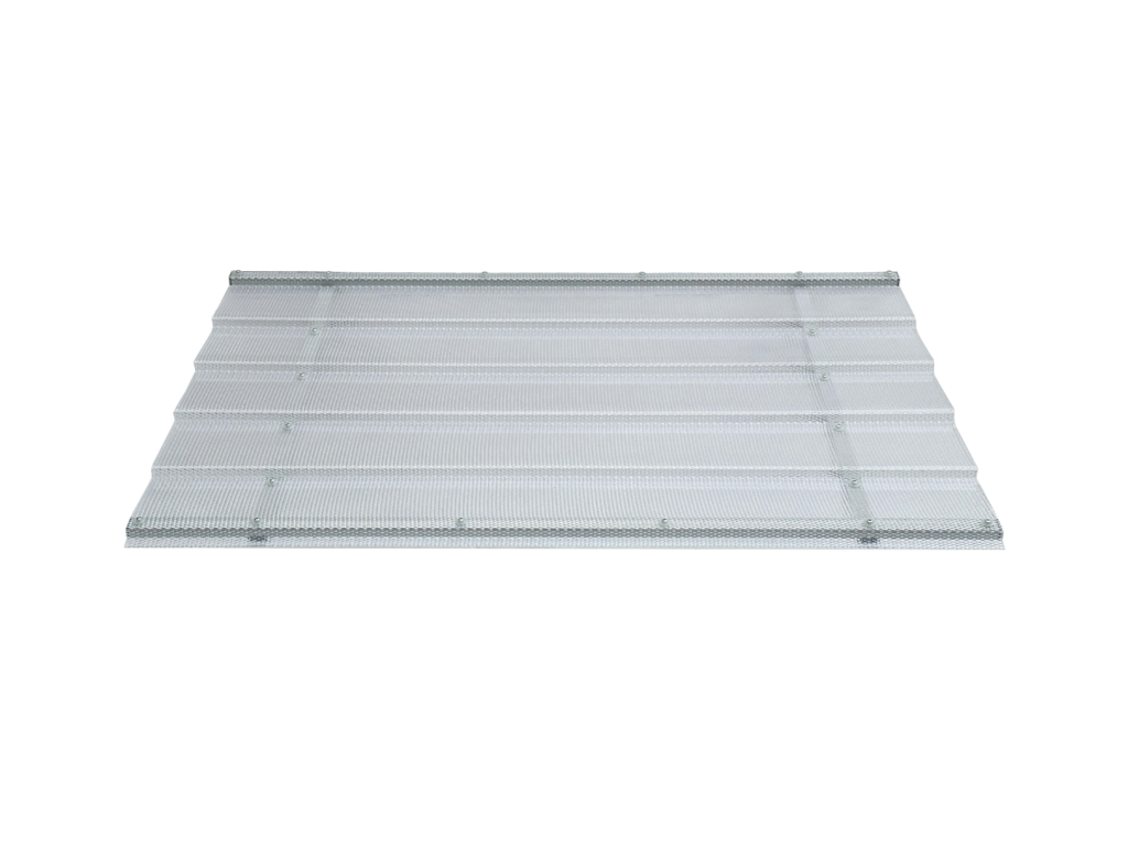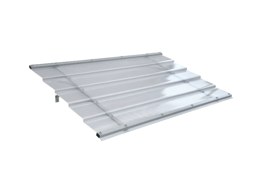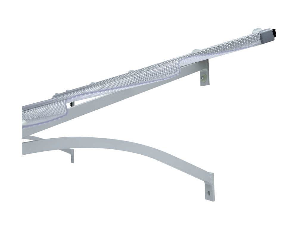 Vchodová stříška má nosnou konstrukci vyrobenou z práškově lakovaného hliníku šedé barvy RAL 7035 a vyplněna je polykarbonátem s UV filtrem a dekorativním diamantovým povrchem. Stříšku nabízíme v rozměrech - šířka 150 cm × hloubka 95 cm. Hliníková konstrukce perfektně odolává vlivům počasí, i po letech je pevná a stabilní. Polykarbonát v zimě mrazem nekřehne a ani na silném letním slunci nedochází ke změnám barvy.