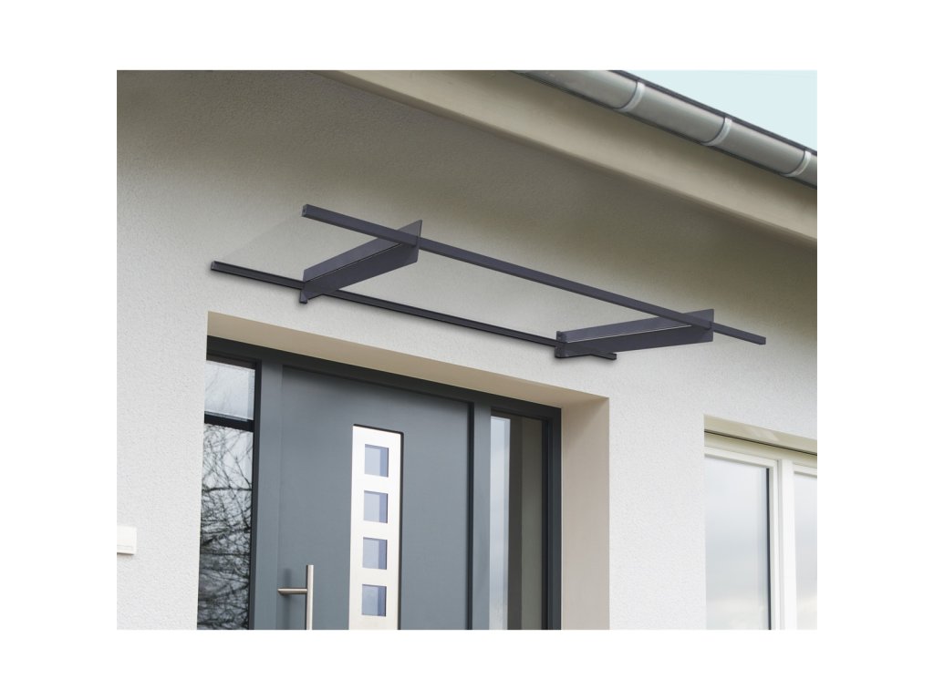 Pultová stříška Nancy 2050, jednoduchá a elegantní vchodová stříška je dokonalou ochranou dveří před deštěm, sněhem a větrem. Lehké zastřešení připravené k samostatné montáži bez potřeby použití dodatečných pomocných podpěr. Odolné nerezové hliníkové profily. Práškově lakované a pozinkované ocelové podpěry. Tvar předního profilu i zadní skryté těsnění zajišťují při dešti odvod vody do bočních stran.