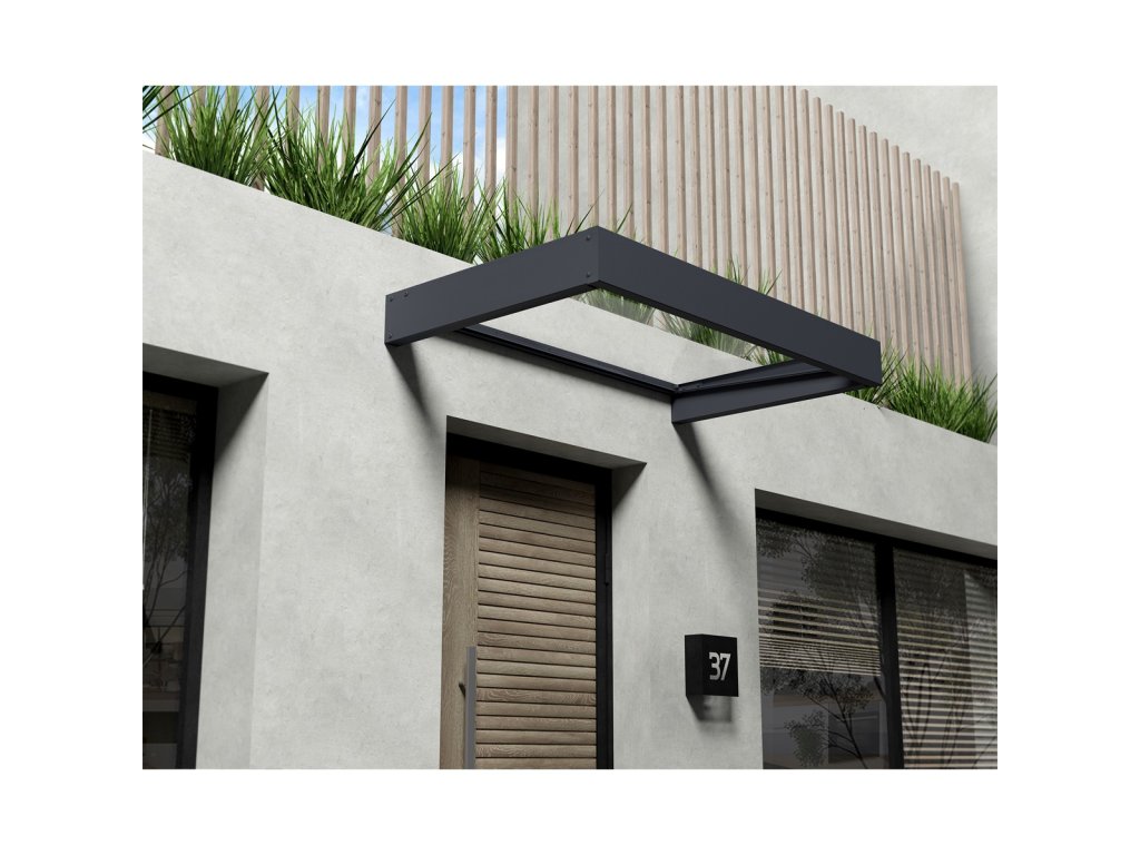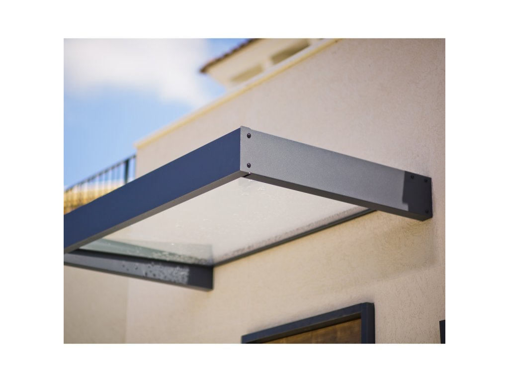Stříšku nabízíme v rozměrech -160 x 95 x 17 cm a barevné kombinaci - antracitové profily + zasklení čirým polykarbonátem 4 mm.