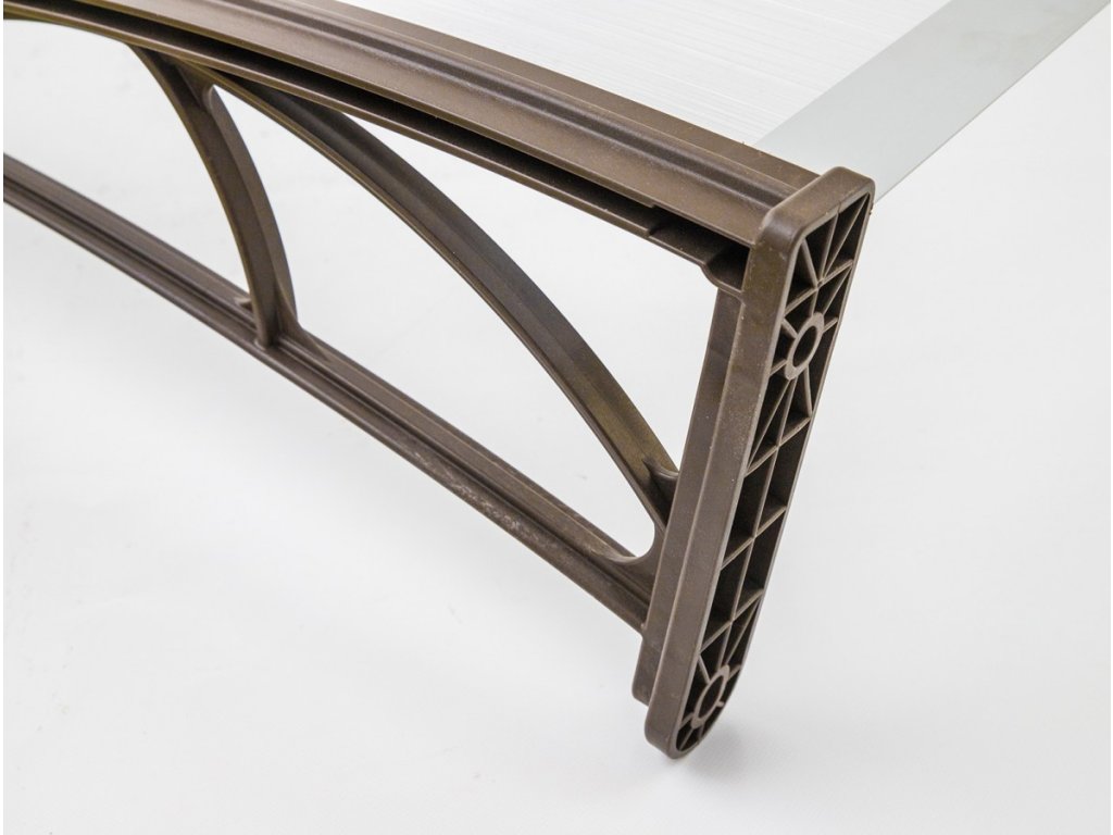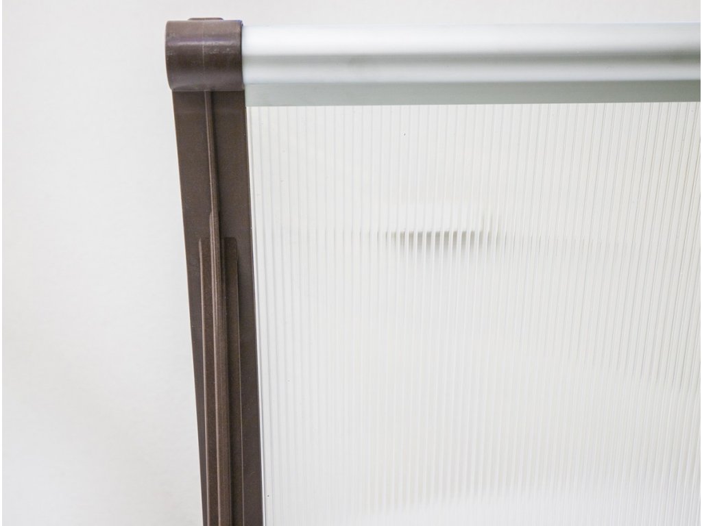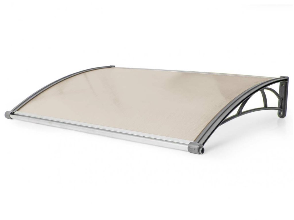 Stříšku nabízíme v rozměrech - šířka 1200 mm x hloubka 820 mm a barevné kombinaci - šedé profily + zasklení bronzovým dutinkovým polykarbonátem 6 mm.