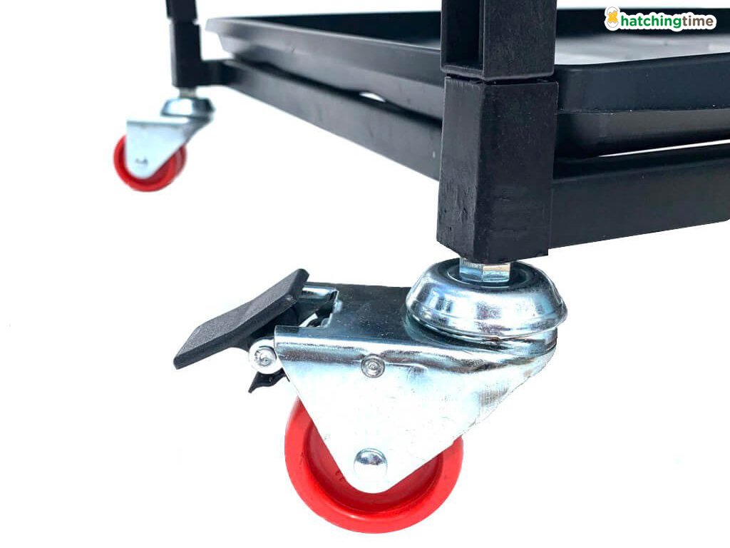 Rozměry složené čtyřpatrové odchovny včetně koleček, nádržky na vodu, ohřevných jednotek a krmítek jsou 104x60x164 cm.