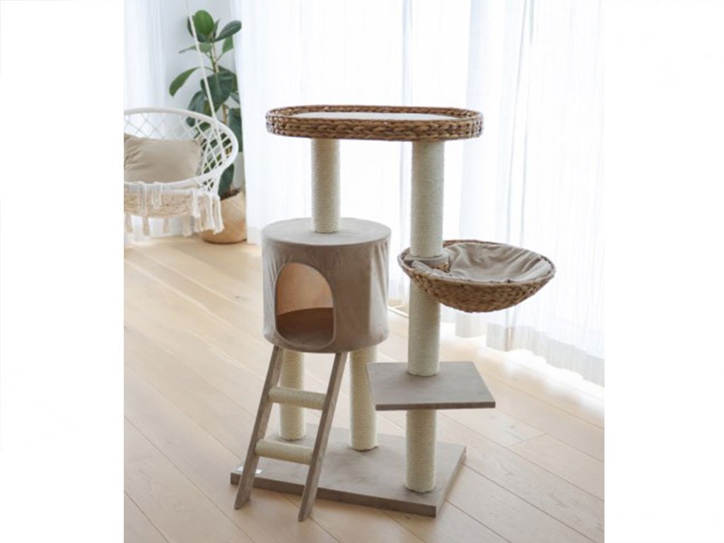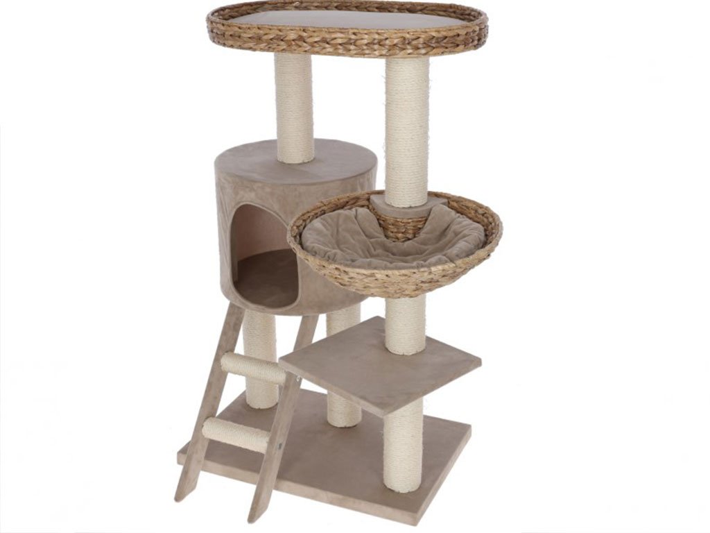 Luxusní škrabadlo a odpočívadlo Banana s plyšovým čalouněním a ručně opletenými pelíšky z přírodních banánových listů v líbivých světlých odstínech. Škrabadlo má pevnou stabilní konstrukci, útulnou kukaň, stylové schůdky a 3 místa pro lenošení a odpočinek.