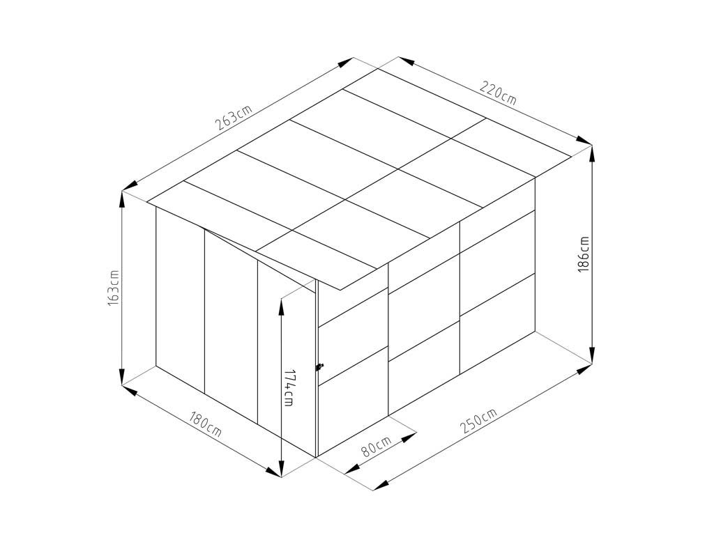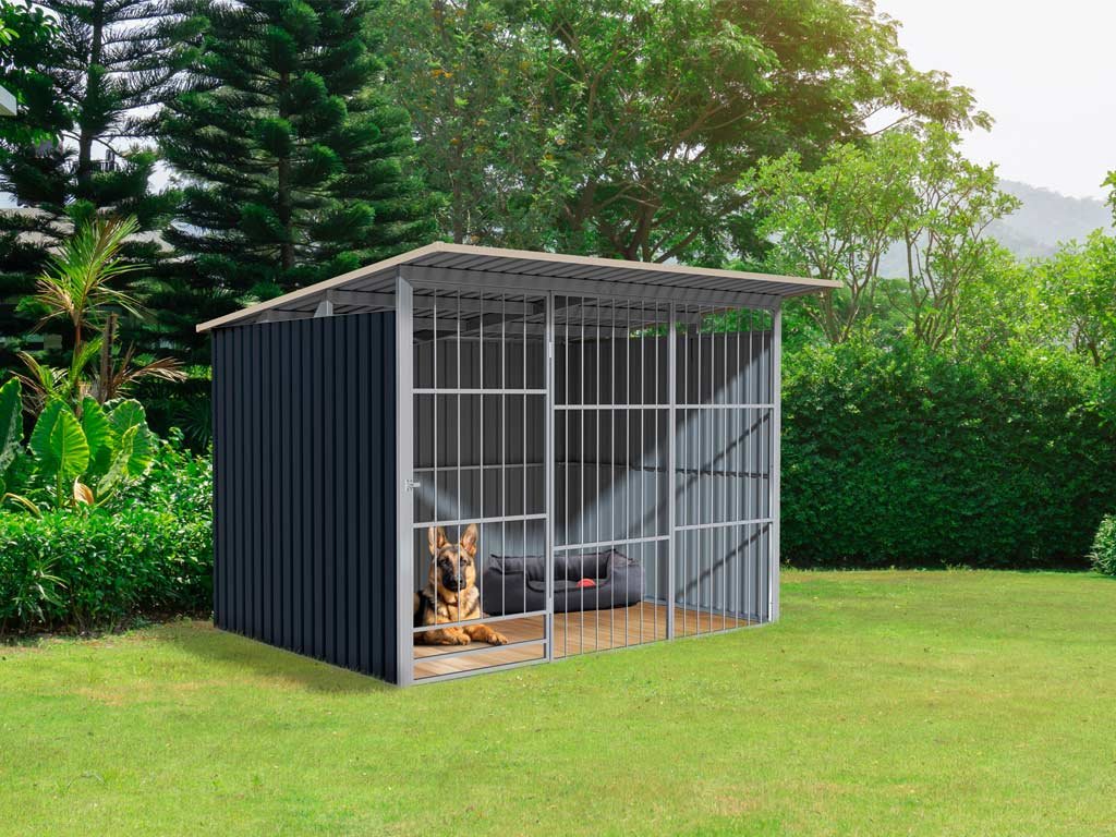 Kotec pro psa G21 o velikosti 260 x 220 cm je prostorný a bytelný, se třemi pevnými stěnami a vyspádovanou střechou. Psí kotec G21 má velké dveře pro snadný přístup i západku na jejich zajištění.