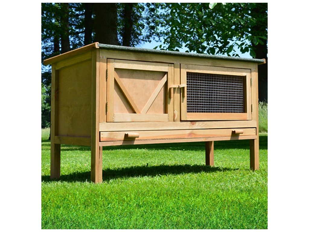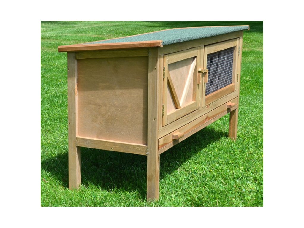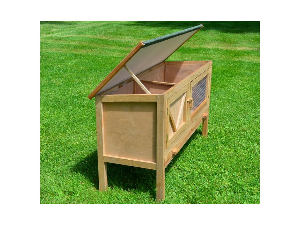 Králíkárna KOŠICE stojí na vysokých dřevěných nohách, abyste ji mohli pohodlně čistit a králíkárna neměla přímý kontakt se zemí. Dřevo je ošetřeno způsobem šetrným k životnímu prostředí a povětrnostním vlivům a je obzvláště trvanlivé. Dvoje dveře umožňují snadný přístup do interiéru.