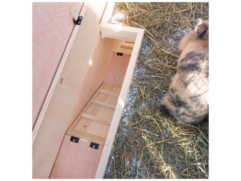 Králíkárna má skládací mřížovou střechu a velké vstupní dveře ve spodním i horním patře.