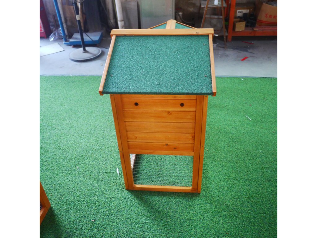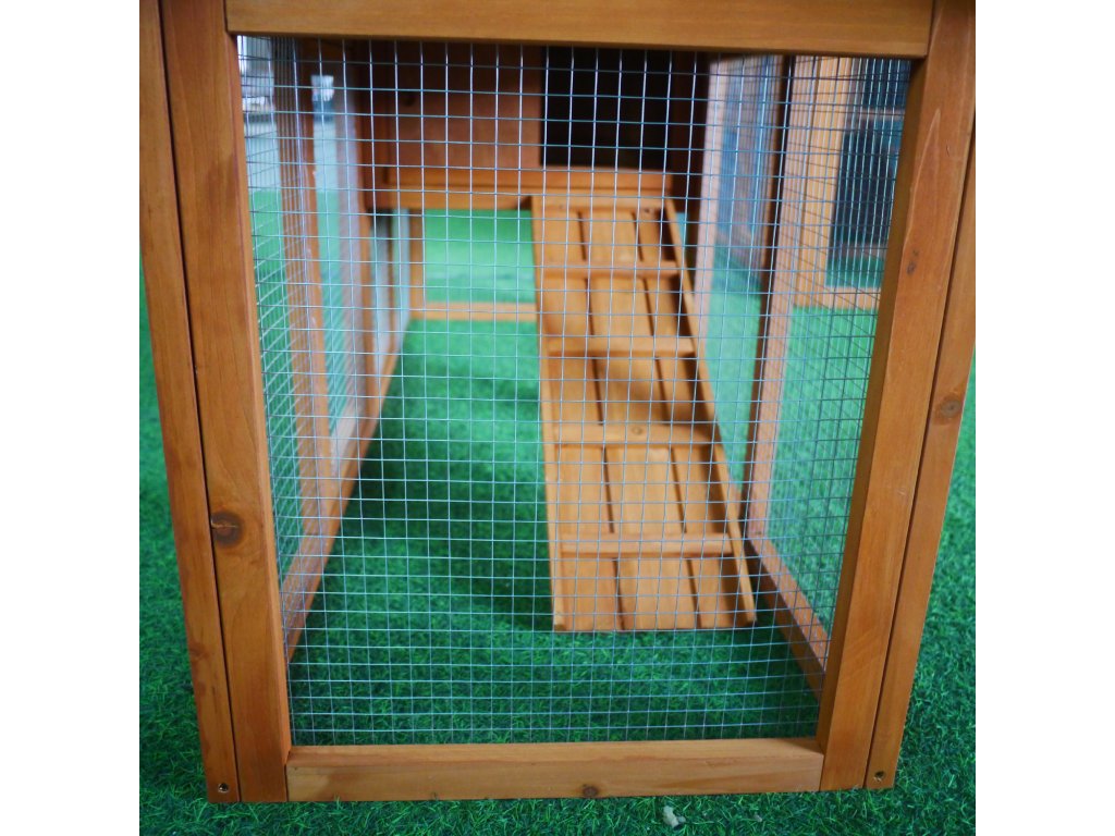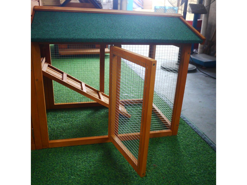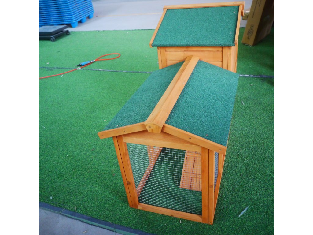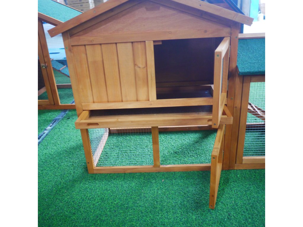 Vhodné pro 4–6 malých zvířat. Vysouvací pozinkovaný podnos pro snadné čištění. Vodotěsná asfaltová střecha, odolná proti dešti a UV záření.