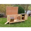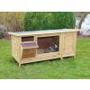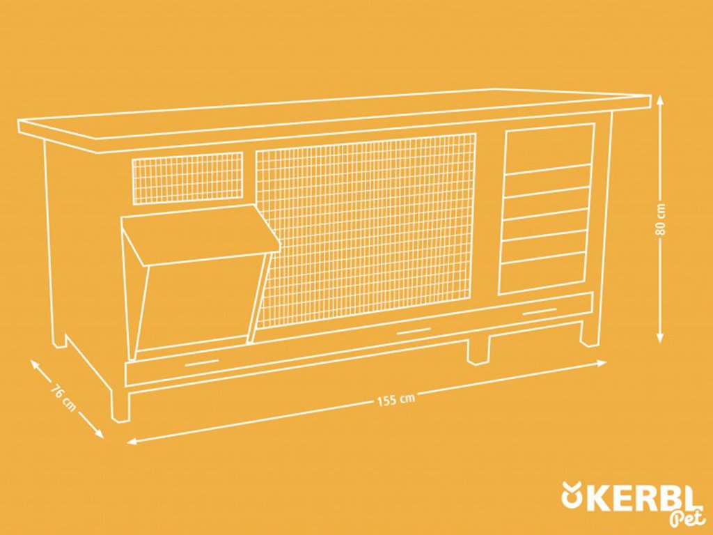 Dřevěná králíkárna KERBL HUTCH XXL VARIO pro chov králíků nebo jiných malých hlodavců o rozměrech 155 x 76 x 80 cm. Jedná se o luxusní králíkárnu, která je vybavena vyjímatelným trusníkem pro snadné čištění, stojanem na seno a prostorem pro uskladnění krmení a doplňků. Bezproblémový přístup do králíkárny zajišťují dvoje přední a jedny boční dveře a také výklopná střecha.