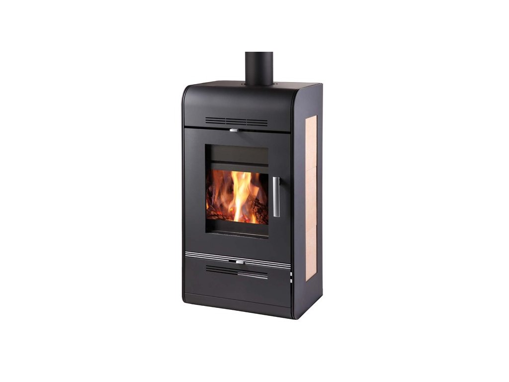 Krbová kamna s výměníkem Haas+Sohn ANDRUS v černém provedení s béžovou dlažbou na boku najdou své uplatnění v novostavbách i stávající zástavbě. Kamna spojují tradiční obdélníkový tvar a moderní design s decentně zaoblenými hranami.