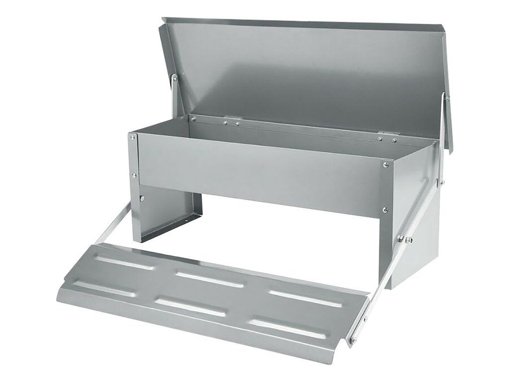 Nášlapný mechanismus – víko se otevře pouze při zatížení (např. slepicí), čímž se zabrání plýtvání a znečištění krmiva.