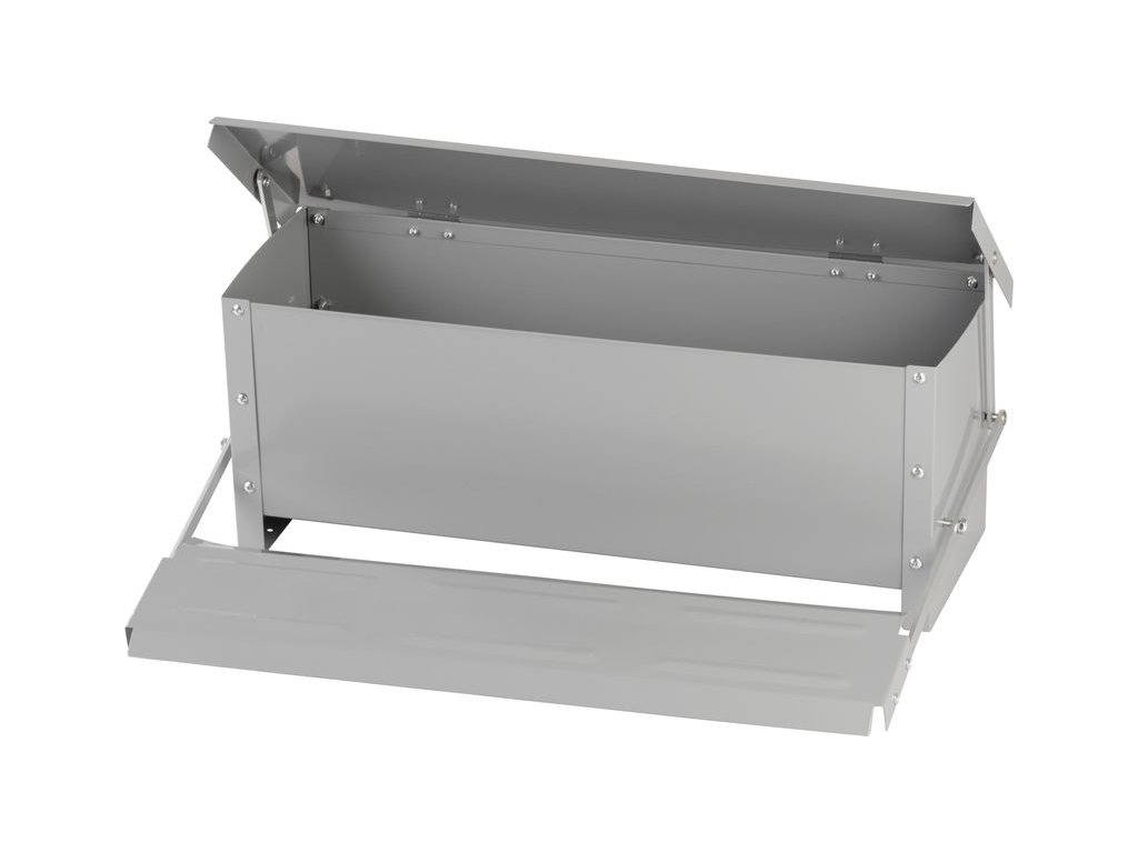 Nášlapný mechanismus – víko se otevře pouze při zatížení (např. slepicí), čímž se zabrání plýtvání a znečištění krmiva.