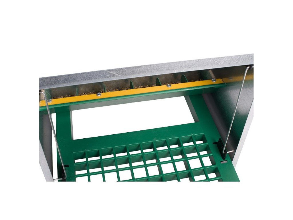 Samotné krmítko je opatřeno přepážkami a přelévací hranou, které výrazně omezují vypadávání krmiva. Další užitečná výhoda;díky použití plastu je krmítko mnohem tišší než jeho konkurenti. Kov na plast vytváří méně hluku než kov na kov.Stupátko má velké otvory, takže výkaly propadnou dolů. Mechanismus, který řídí přístup, lze nastavitod 250 gramů do 2 kg (165 liber). Tímto způsobem lze nastavit správnou prahovou hmotnost pro drůbež jakéhokoli druhu.