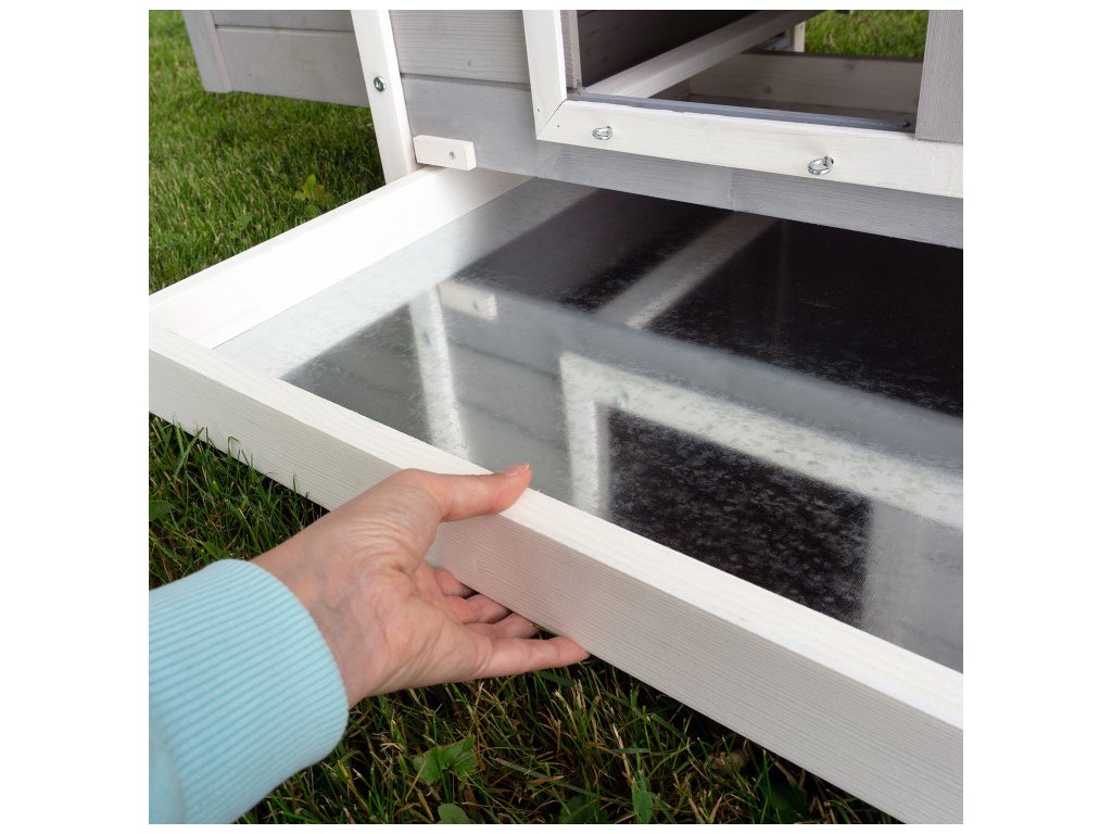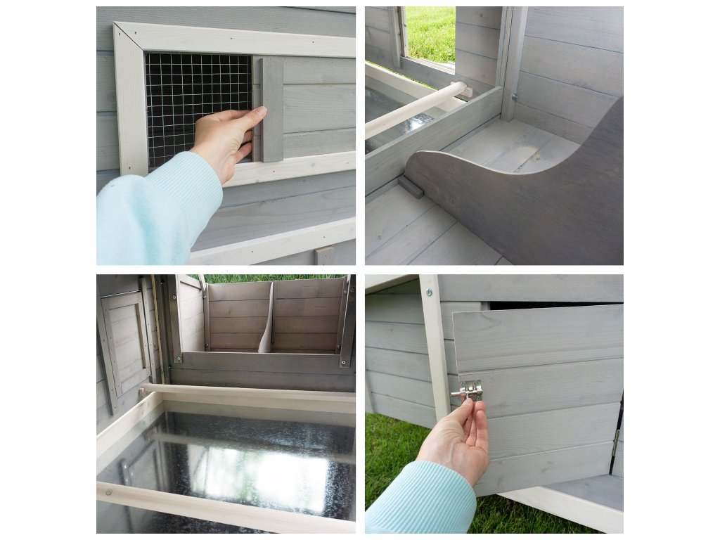 Pro snadný přístup je kurník vybaven hned dvěma dvířky. Jedny dvířka jsou umístěna z přední strany kurníku, druhý vstup je z boční strany s protiskluzní rampou. Samotný výběh je vybaven dvířky pro Váš snadný přístup pro výměnu krmení a vody. Čištění kurníku zvládnete hravě během chvilky díky výsuvnému trusníku. Také čištění snáškového hnízda nebude problém, díky výklopné stříšce.
