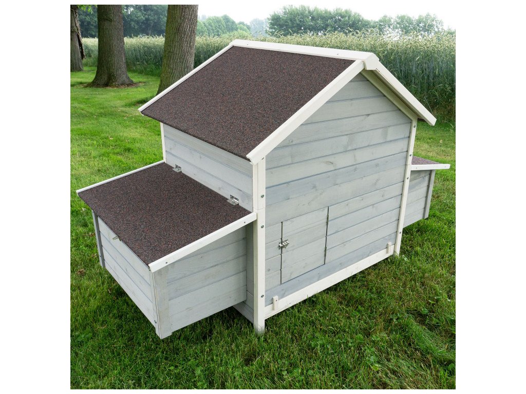 Kurník vyrobený z borovicového dřeva má hmotnost cca 44 kg, a tak zajišťuje velkou stabilitu. Kurník není zateplený. Pro ochranu proti slunečnímu záření je střecha kurníku i snáškových hnízd pokryta asfaltovou krytinou. Přesto doporučujeme kurník umístit pod přístřešek, aby byl chráněn před deštěm, sněhem a extrémním slunečním záření. Kurník má velké dveře o rozměrech 34 x 68 cm (délka x výška). Dřevěný kurník je povrchově ošetřen základním ochranným nátěrem. Pro delší životnost je třeba, jako u každého dřeva, ochranný nátěr obnovovat.