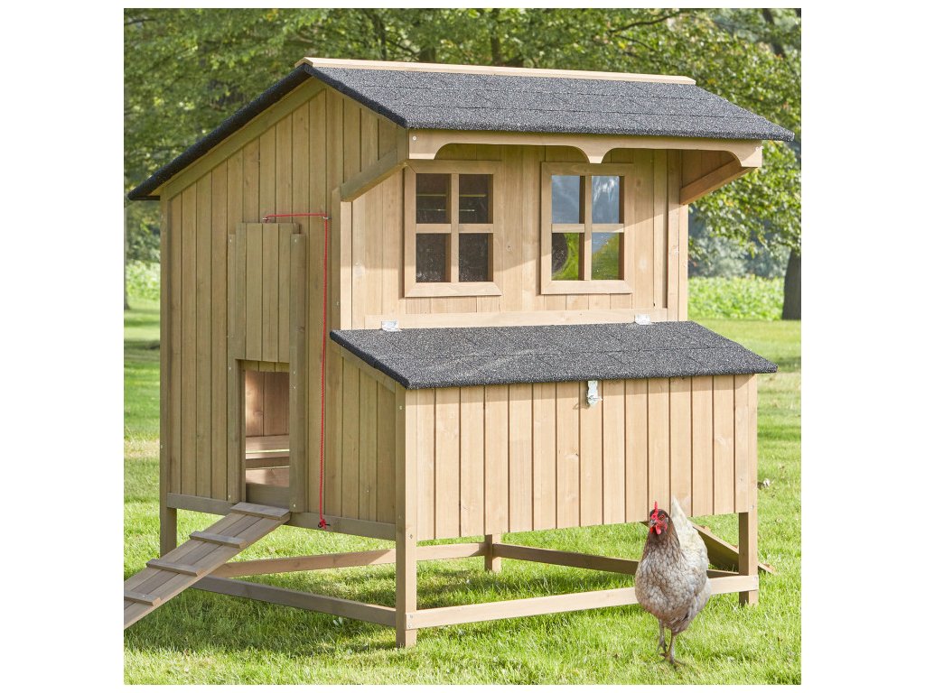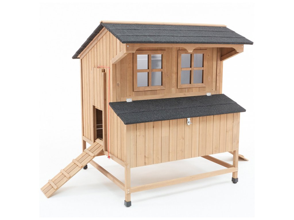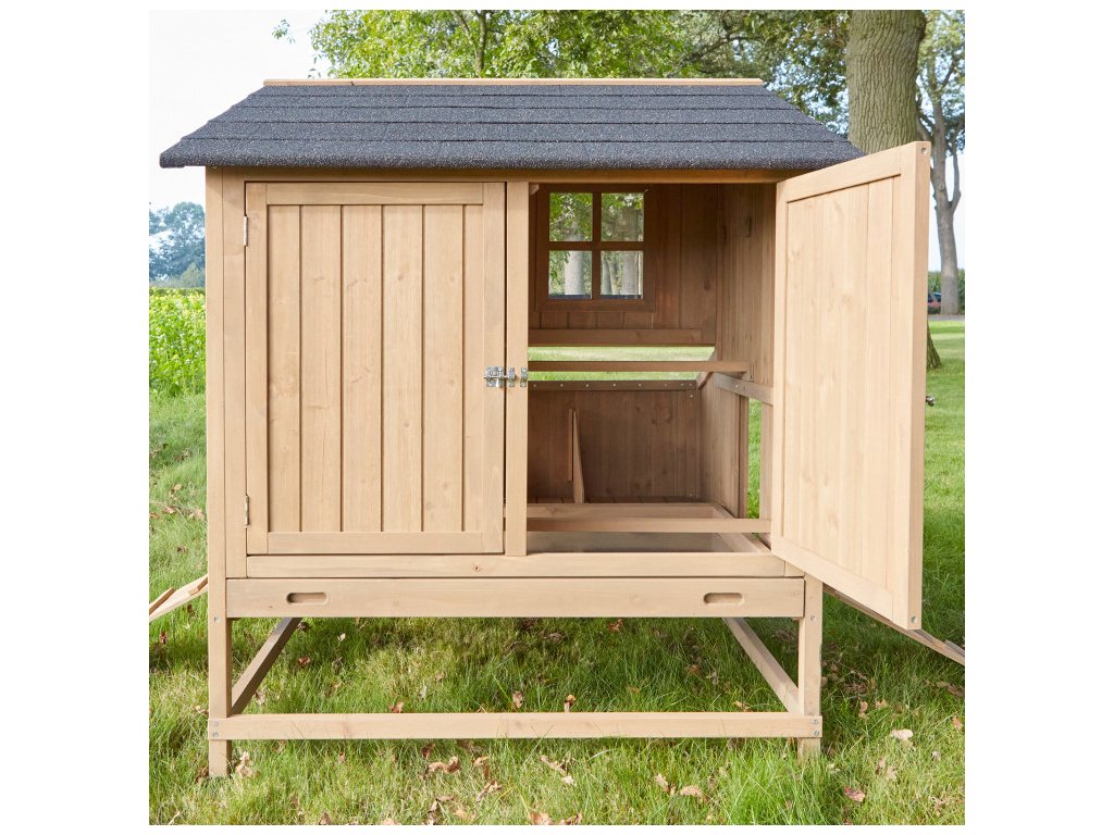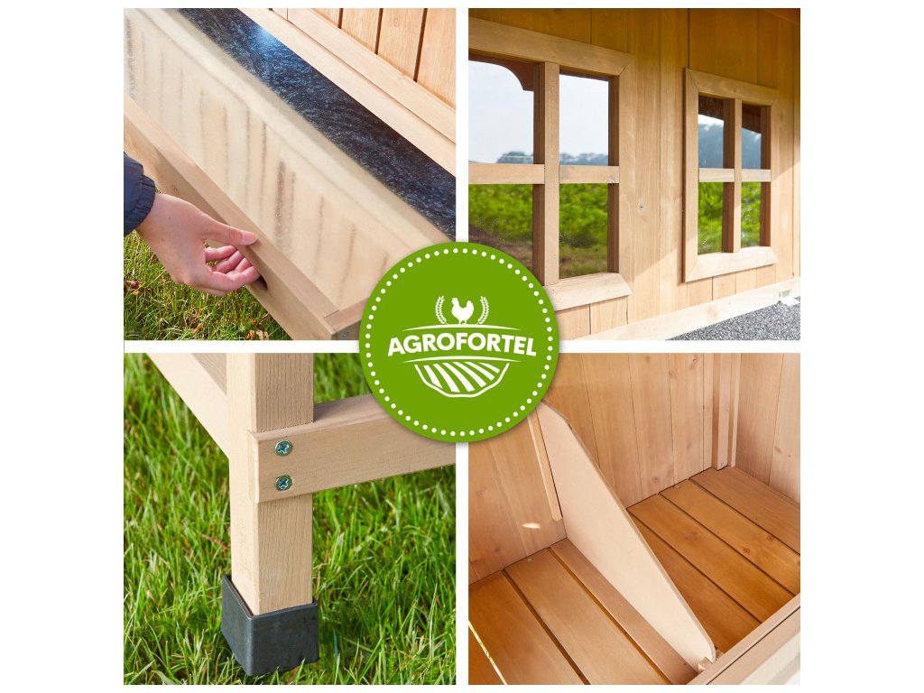 Kurník vyrobený z borovicového dřeva má hmotnost cca 44 kg a zajišťuje tak velkou stabilitu. Pro efektivní odvětrávání podlahy je umístěn na čtyřech zvýšených nožkách. I přes absenci zateplení zůstávají nosnice pod střechou kurníku i v snáškových hnízdech chráněny asfaltovou krytinou, což představuje opatření proti slunečnímu záření. Nicméně doporučujeme umístit kurník pod nějaký druh přístřešku, aby byl uchráněn před nepříznivými vlivy počasí, včetně deště, sněhu a slunečního záření. Dřevěný kurník je povrchově ošetřen základním ochranným nátěrem. Pro delší životnost je třeba, jako u každého dřeva, ochranný nátěr obnovovat.